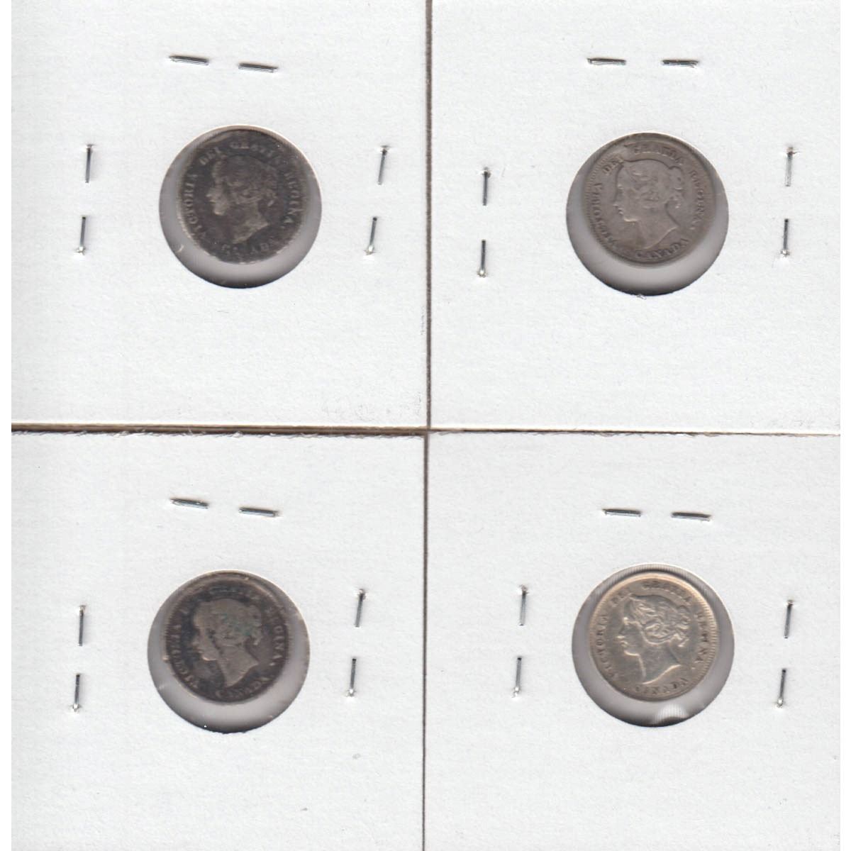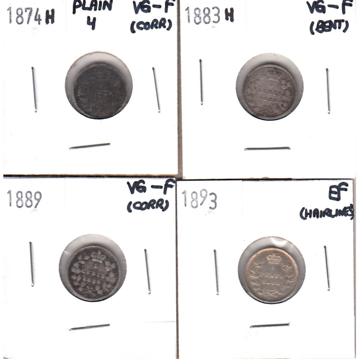 Lot of 4x Canada 5-cent Dated 1874H Plain 4, 1883H, 1889 & 1893 in VG-F or EF (coins have various impairments). 4pcs