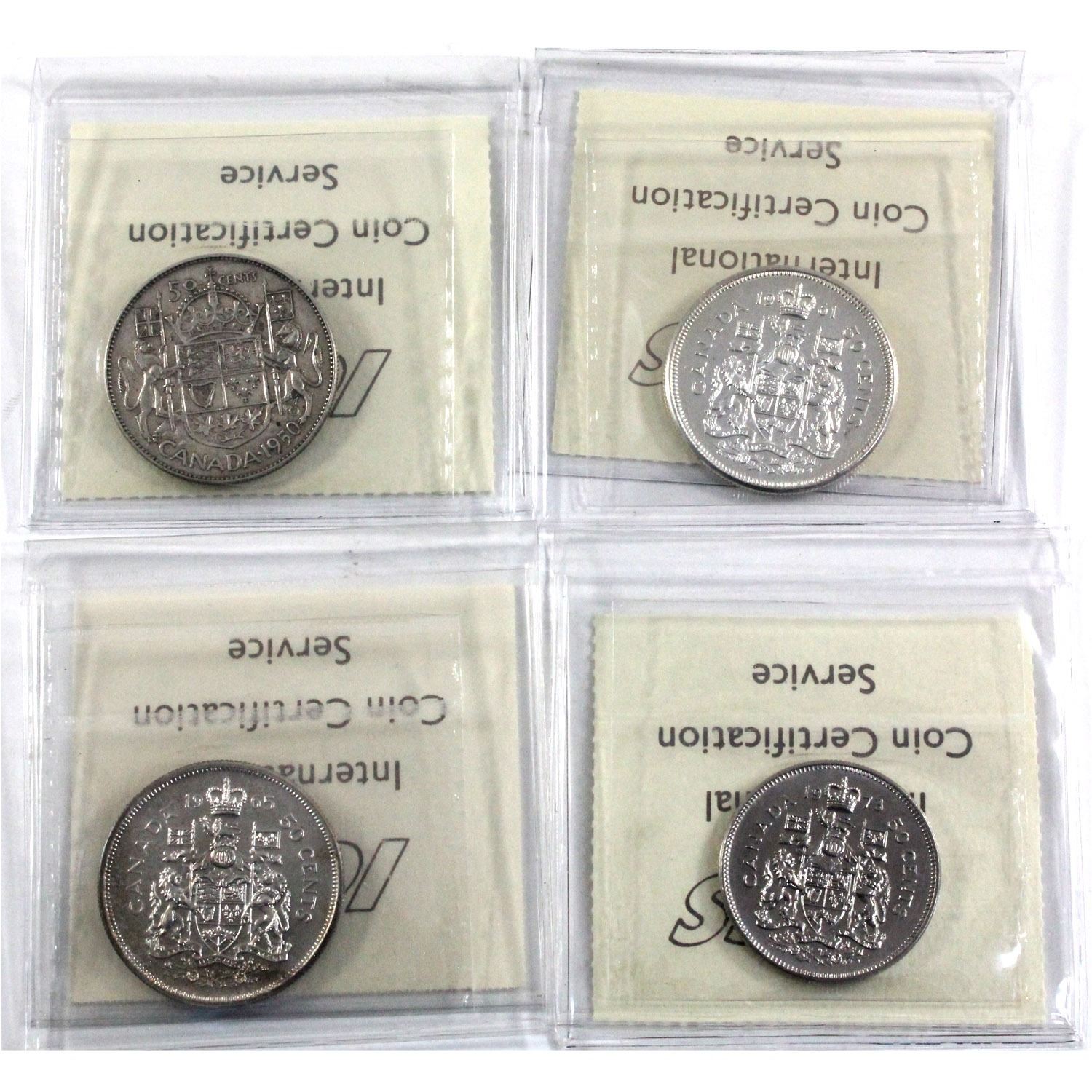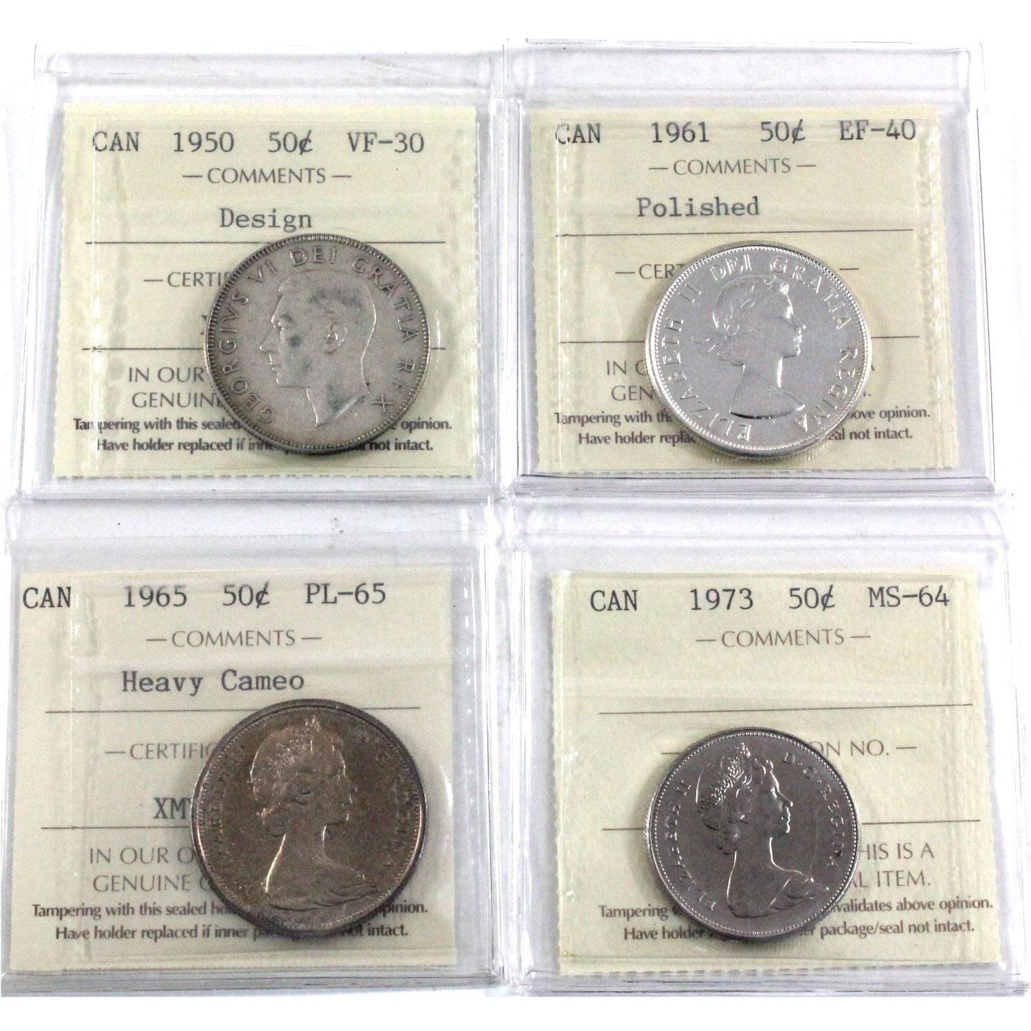 Lot of 4x Canada 50-cents ICCS certified coins: 1950 Design VF-30, 1961 EF-40 (polished), 1965 PL-65 Heavy Cameo & 1973 MS-64. 4pcs