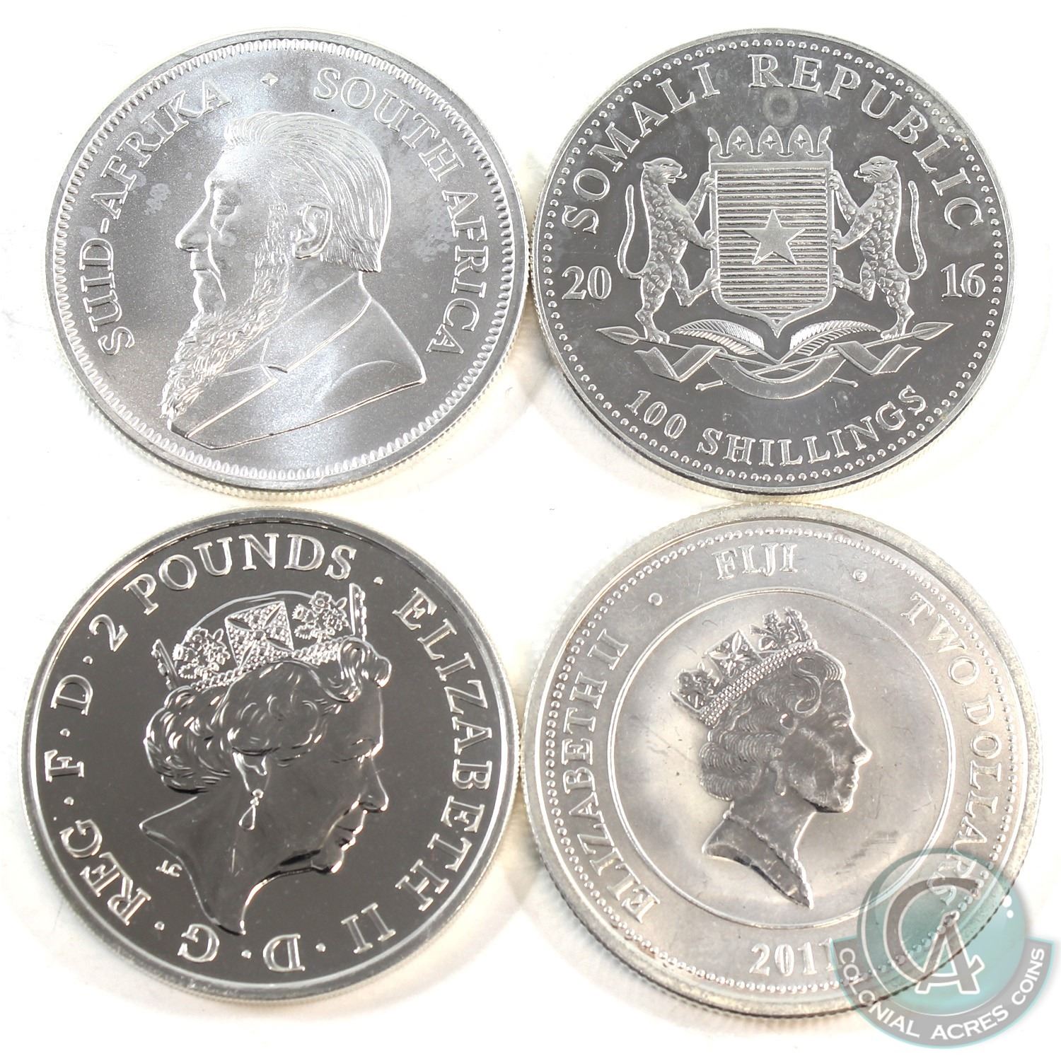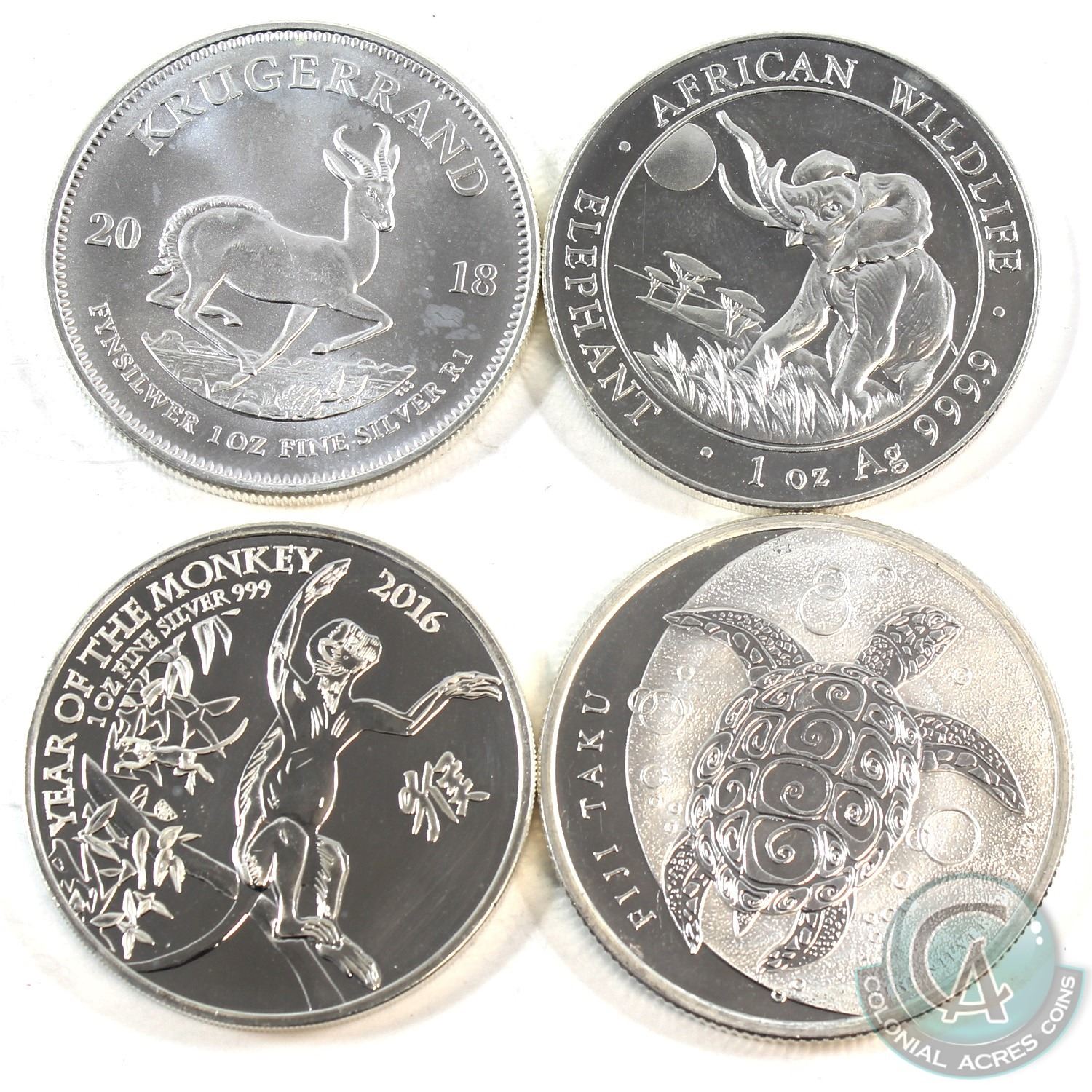 Lot of 4x Different 1oz Fine Silver World Coins - 2011 Fiji Taku, 2016 Great Britain Year of the Monkey, 2016 Somali Elephant & 2018 South Africa Krugerrand (Coins are toned). 4pcs (TAX Exempt)