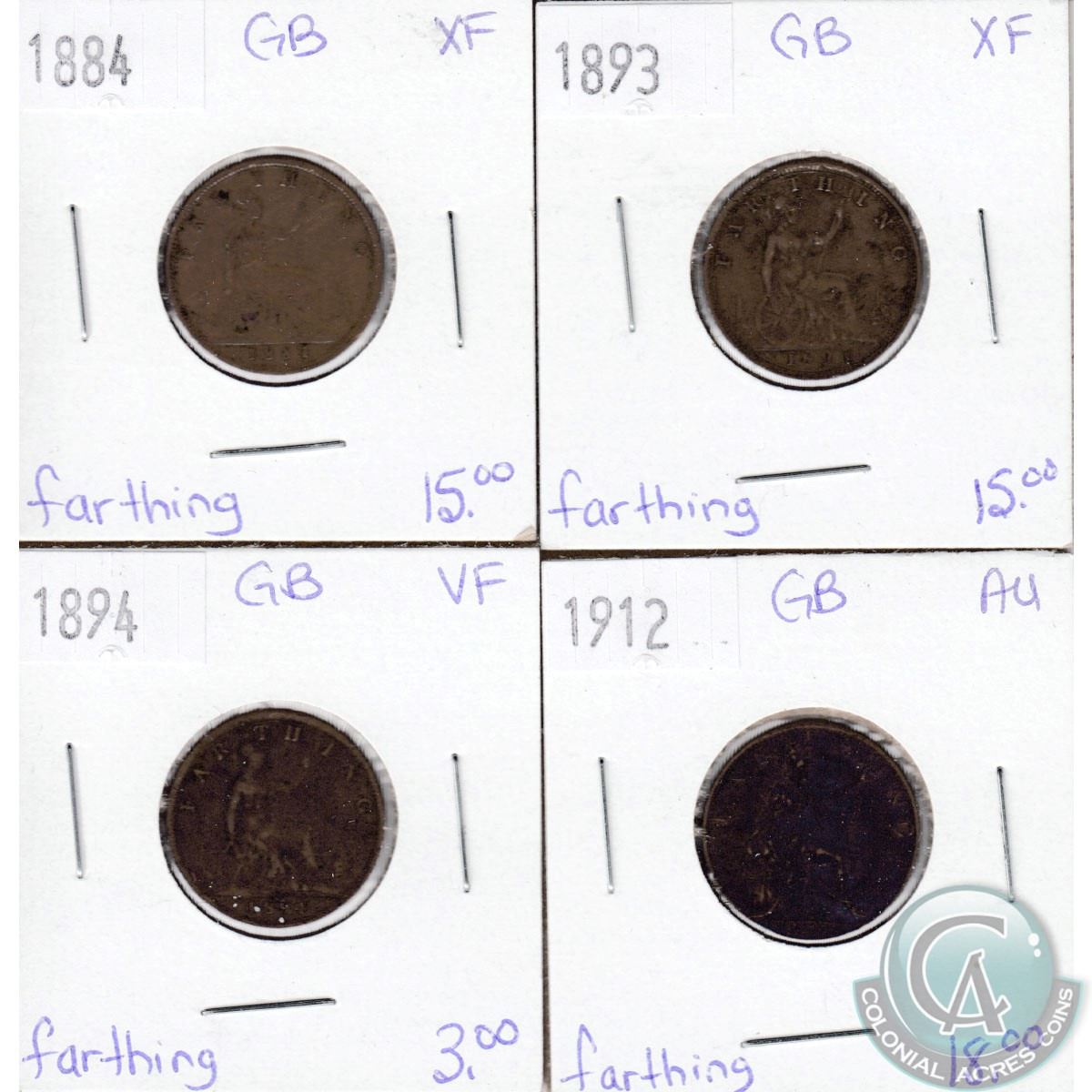 Lot of 4x Great Britain Farthings Dated 1884-1912 in VF to AU-50. 4pcs