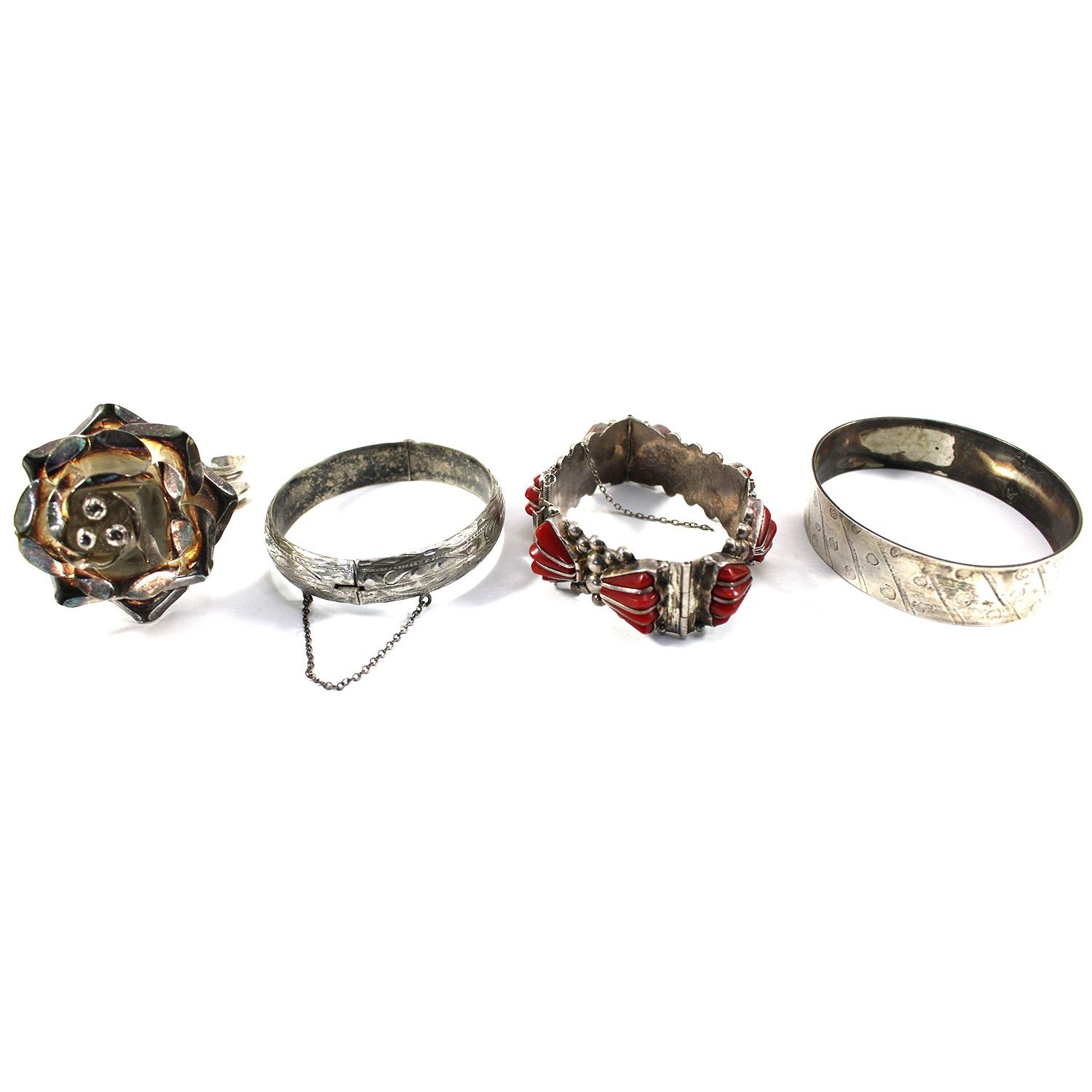 Lot of 4x Sterling Silver Bracelets and Cuff. 156.2 gram total weight. See image for designs. 4pcs