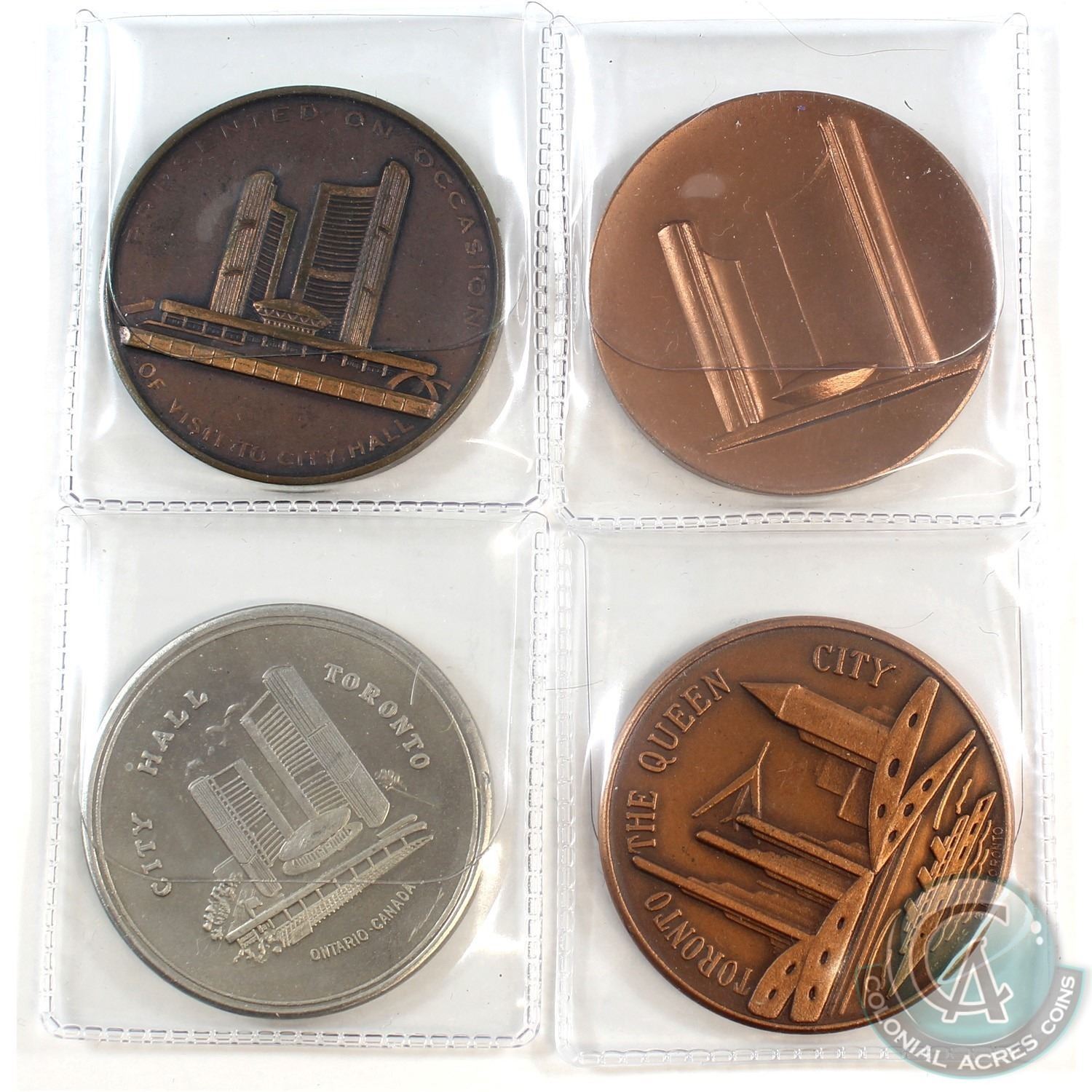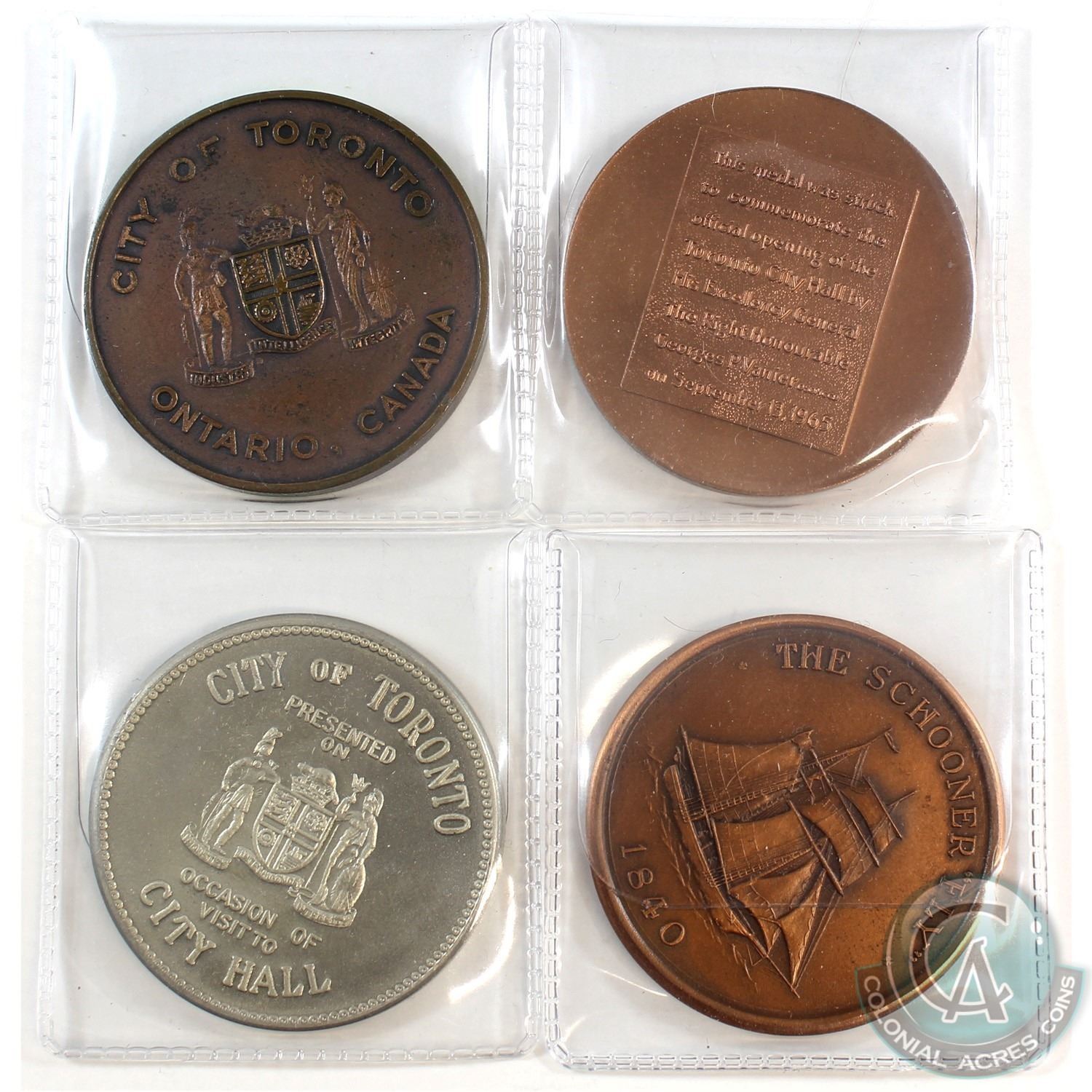 Lot of 4x Toronto City Medals. You will receive 3x different designs of the Toronto City Hall & 1840 'The Schooners "Fly"' Toronto the Queen City design. 4pcs