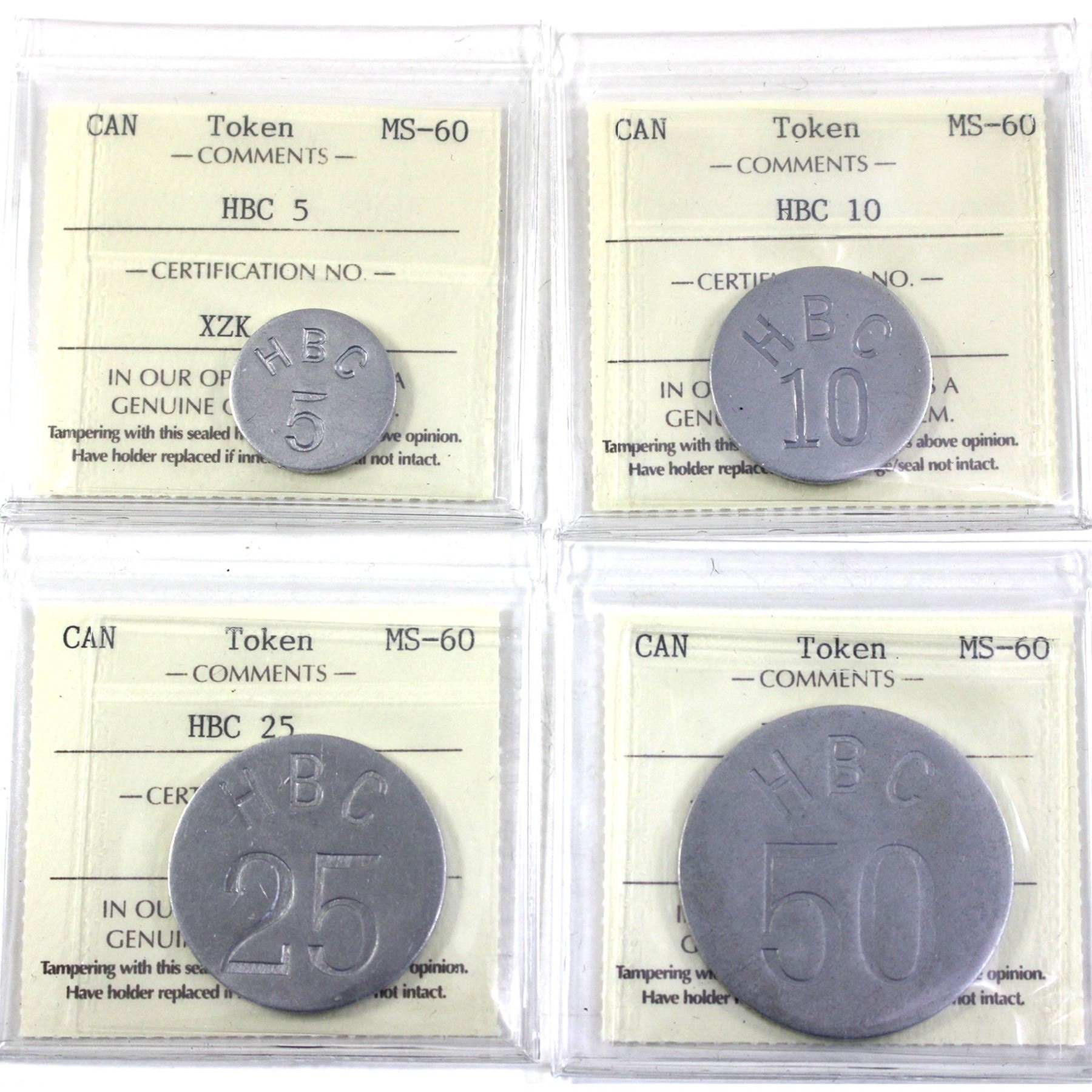 Lot of 4x Trade Tokens ND (Circa 1946) Hudson's Bay Company-Eastern Arctic, Trade Tokens ICCS Certified MS60. Includes: 5c, 10c, 25c, & 50c. 4pcs.
