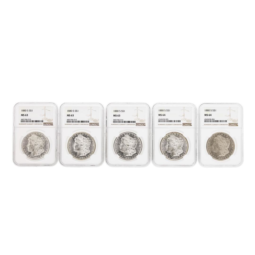 One Lot of (5) 1880-S $1 Morgan Silver Dollar Coins NGC MS63 & MS64. NGC Certified.
