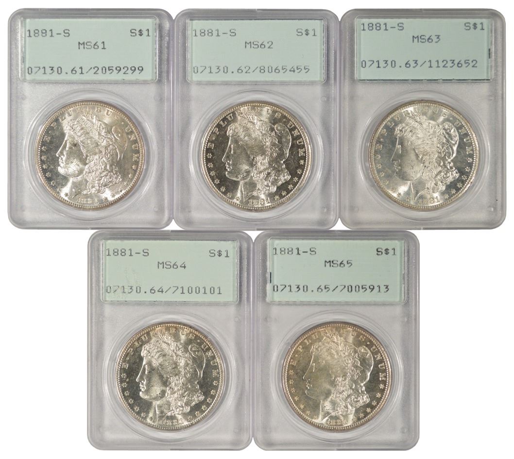 One Lot of (5) 1881-S $1 Morgan Silver Dollars PCGS MS61-65.