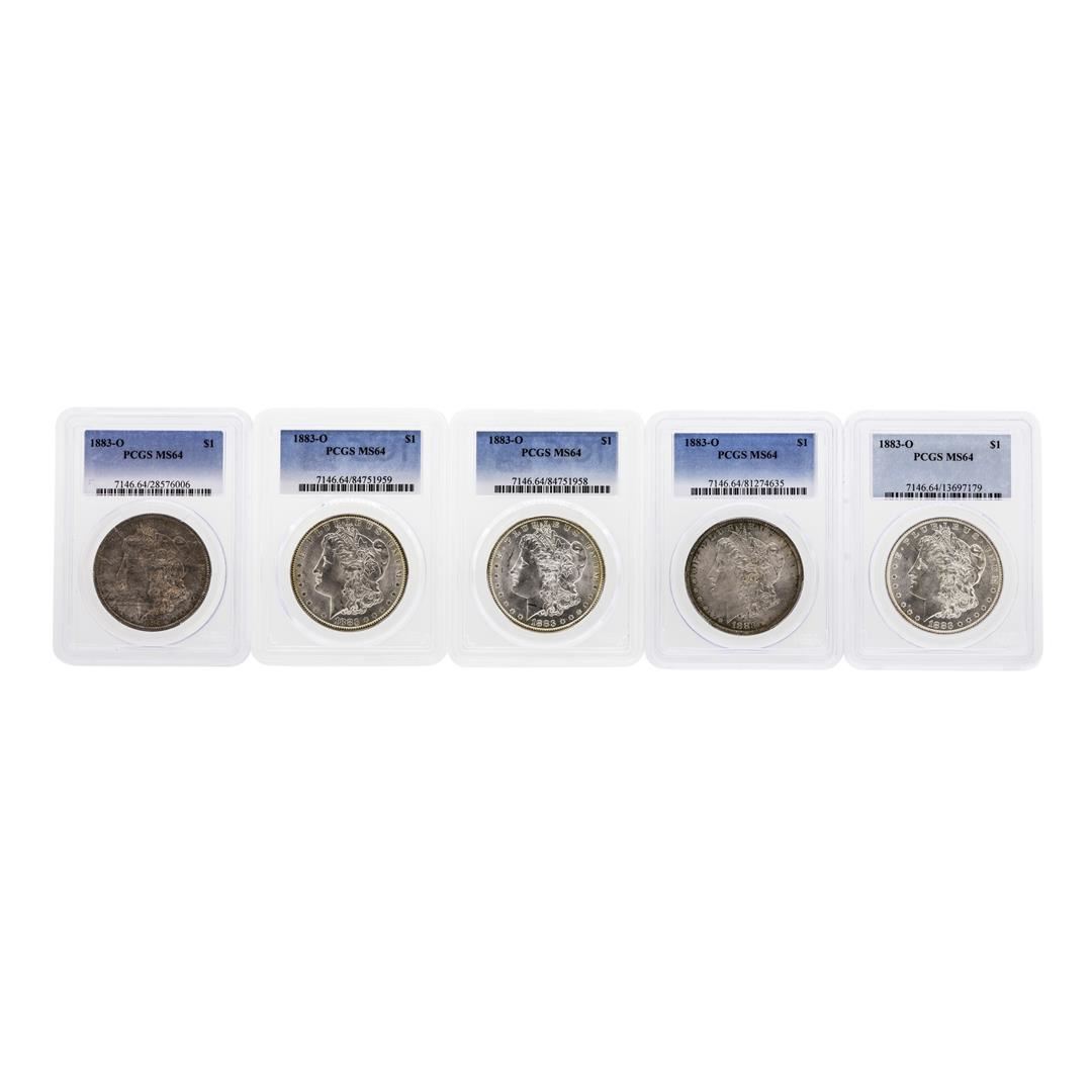 One Lot of (5) 1883-O $1 Morgan Silver Dollar Coin PCGS MS64. PCGS Graded.