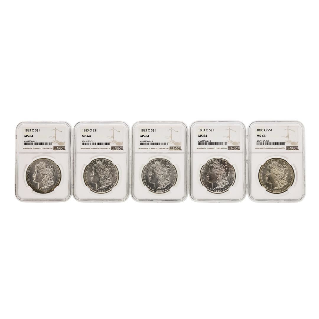 One Lot of (5) 1883-O $1 Morgan Silver Dollar Coins NGC MS64. NGC Certified.