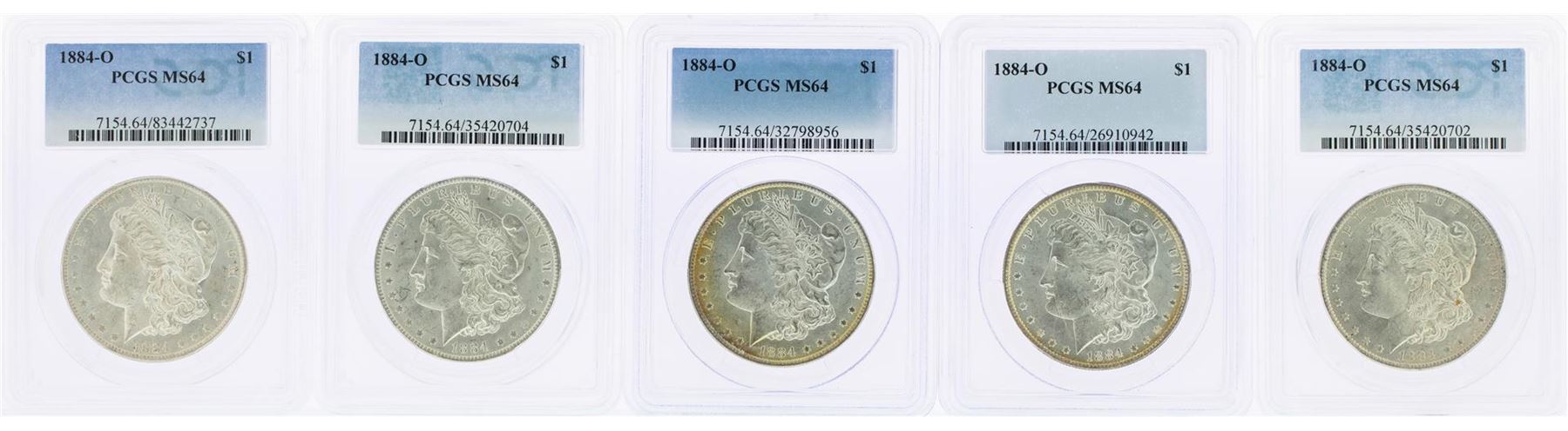 One Lot of (5) 1884-O $1 Morgan Silver Dollar Coins PCGS MS64. PCGS Graded.