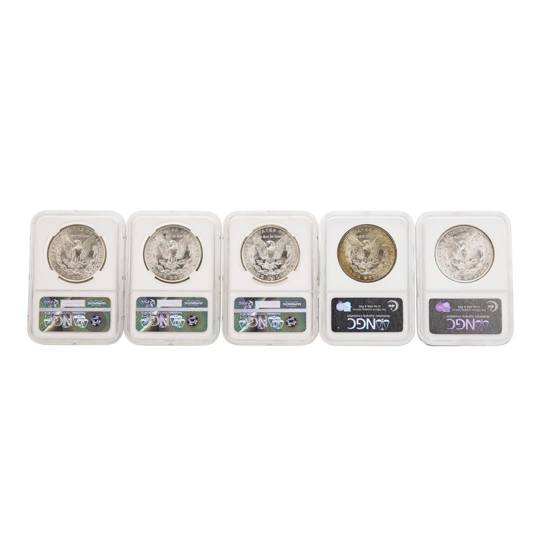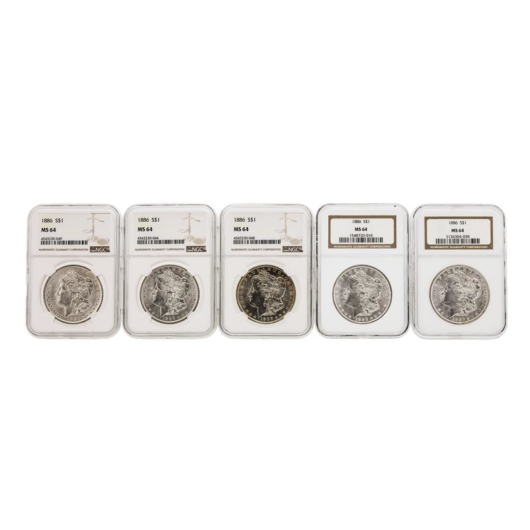 One Lot of (5) 1886 $1 Morgan Silver Dollar Coins NGC MS64. NGC Certified.