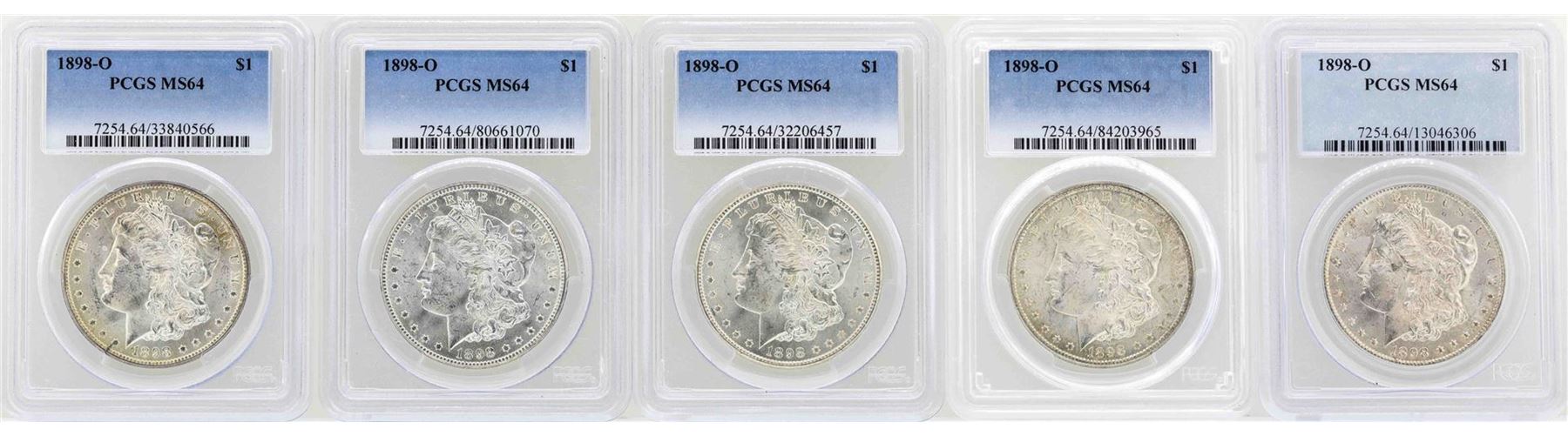 One Lot of (5) 1898-O $1 Morgan Silver Dollar Coins PCGS MS64. PCGS Graded.