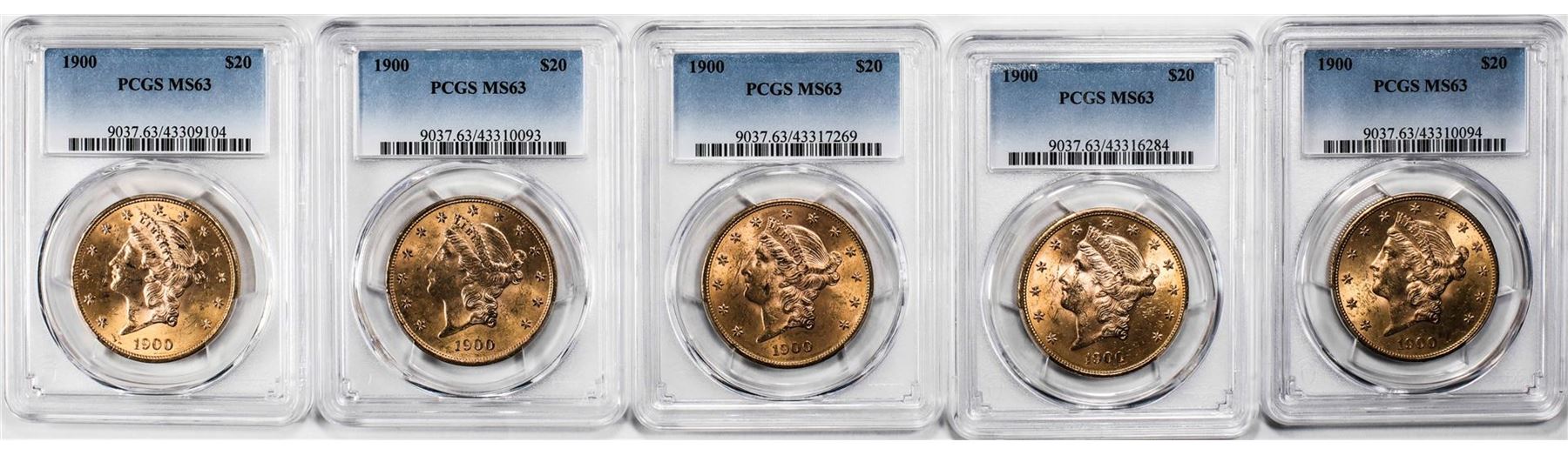 One Lot of (5) 1900 $20 Liberty Head Gold Coin PCGS MS63.