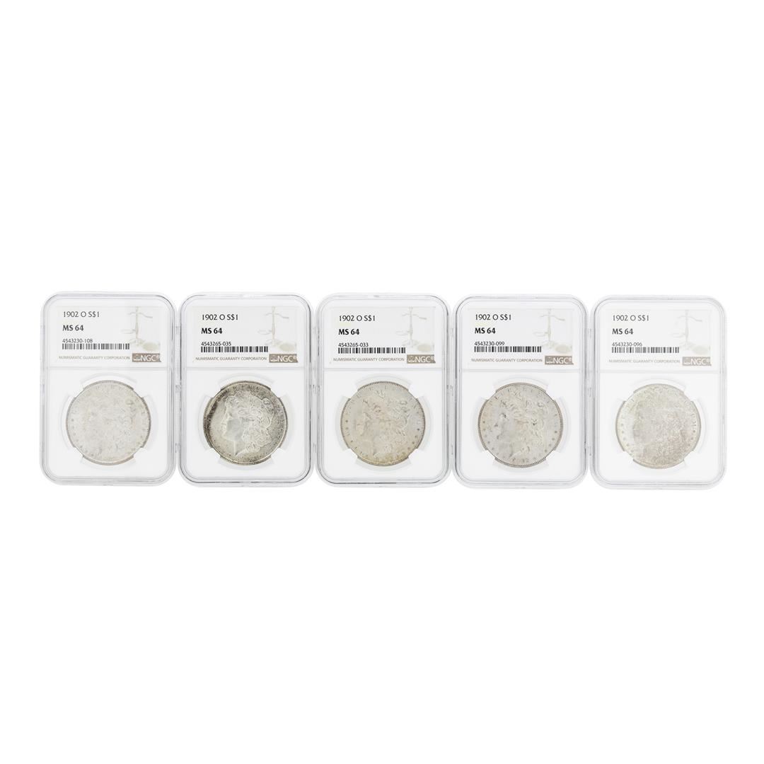 One Lot of (5) 1902-O $1 Morgan Silver Dollar Coins NGC MS64. NGC Certified.