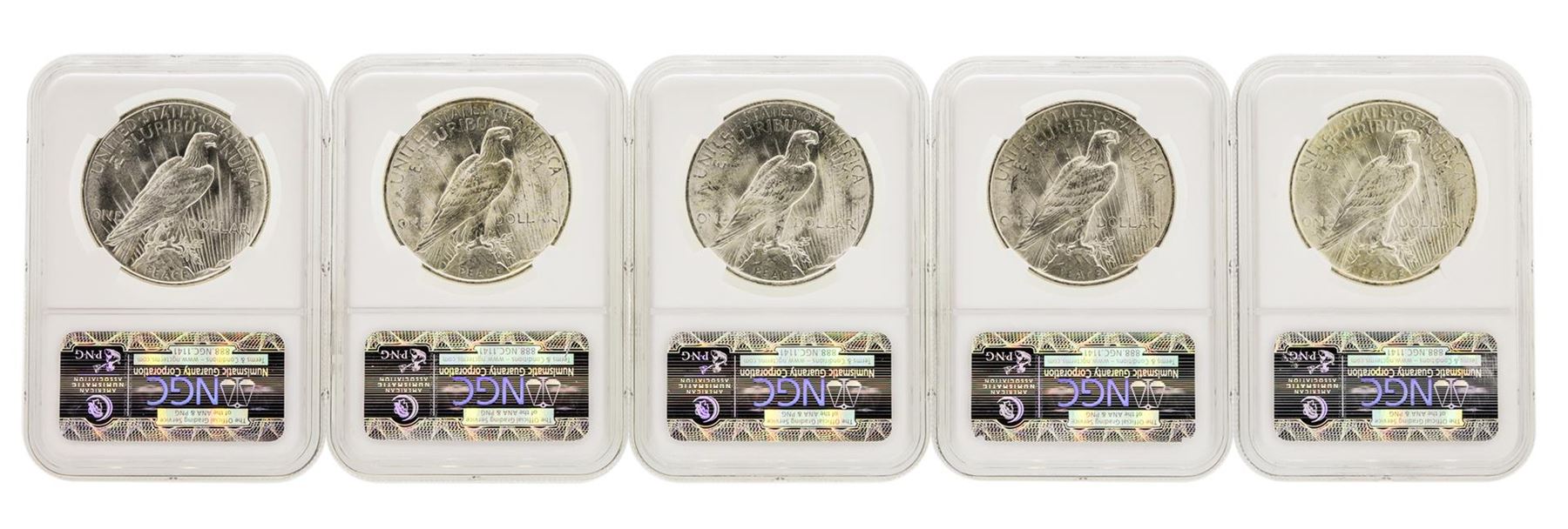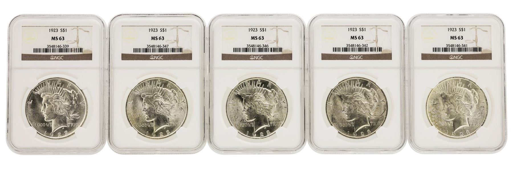 One Lot of (5) 1923 $1 Peace Silver Dollar Coins NGC MS63. NGC Certified.
