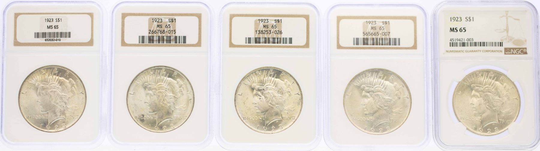One Lot of (5) 1923 $1 Peace Silver Dollar Coins NGC MS65.