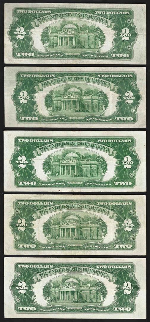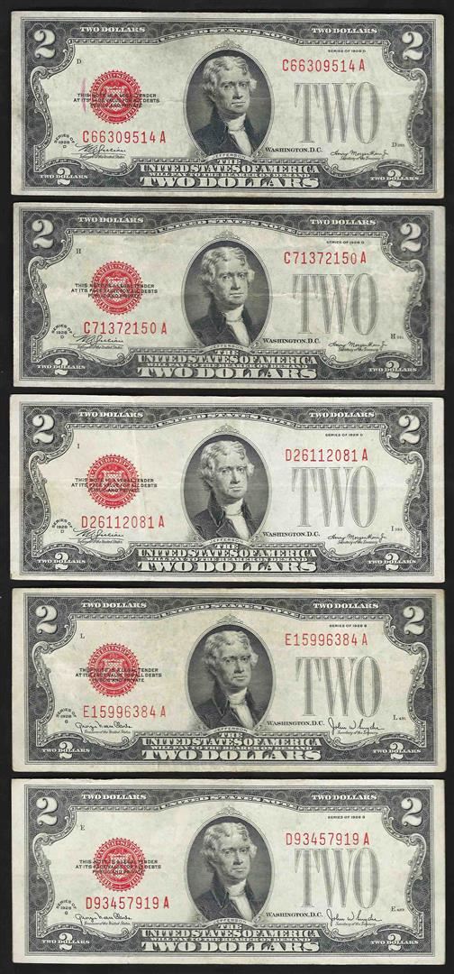 One Lot of (5) 1928 $2 Legal Tender Notes.