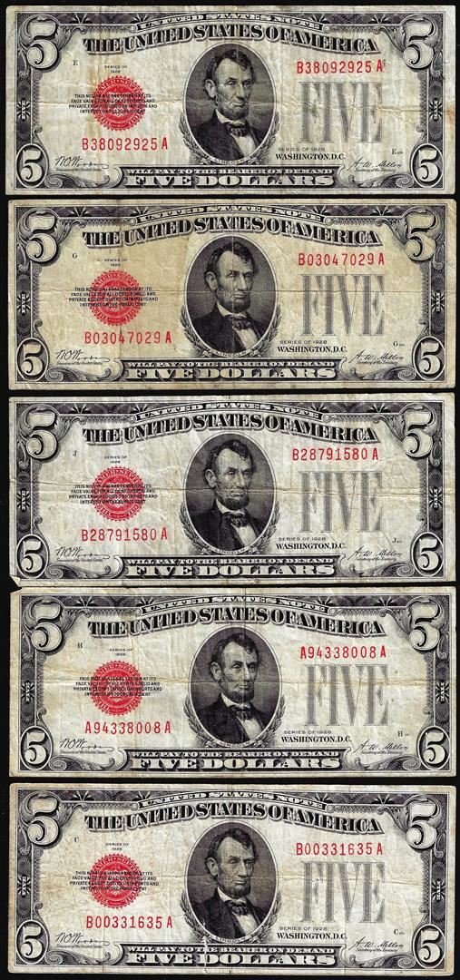 One Lot of (5) 1928 $5 Legal Tender Notes.