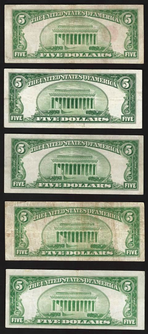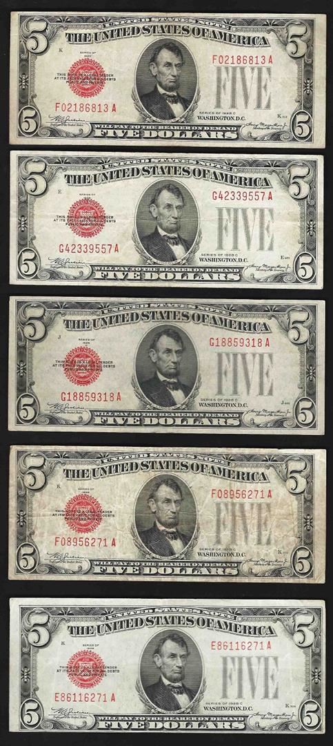 One Lot of (5) 1928C $5 Legal Tender Notes.