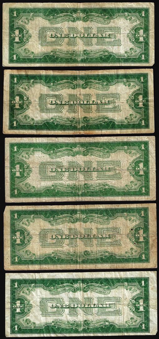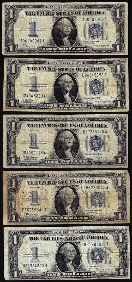 One Lot of (5) 1934 $1 Funnyback Silver Certificate Notes.