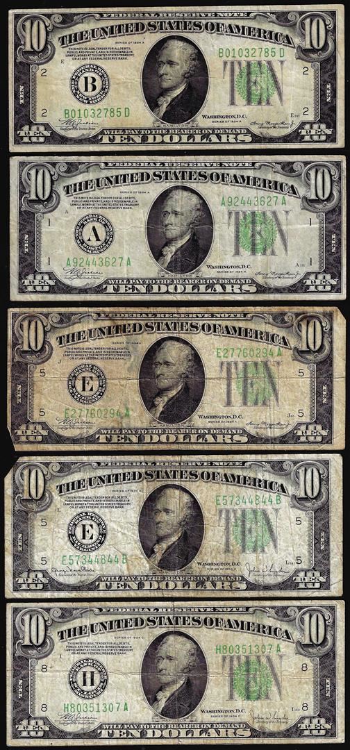 One Lot of (5) 1934 $10 Federal Reserve Notes.