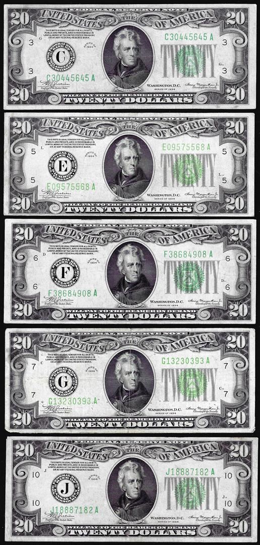 One Lot of (5) 1934 $20 Federal Reserve Notes.