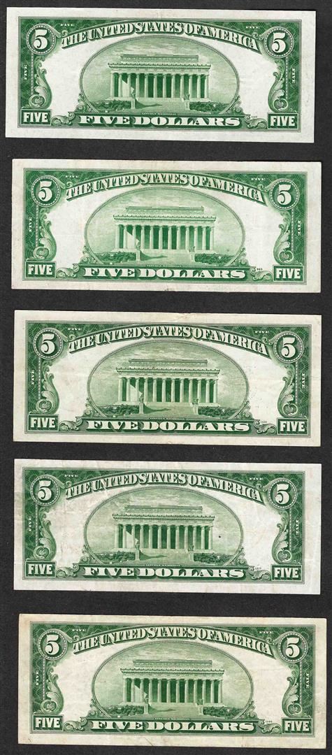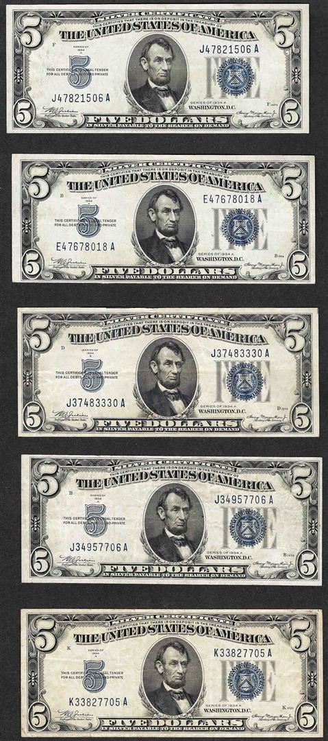 One Lot of (5) 1934A $5 Silver Certificate Notes.