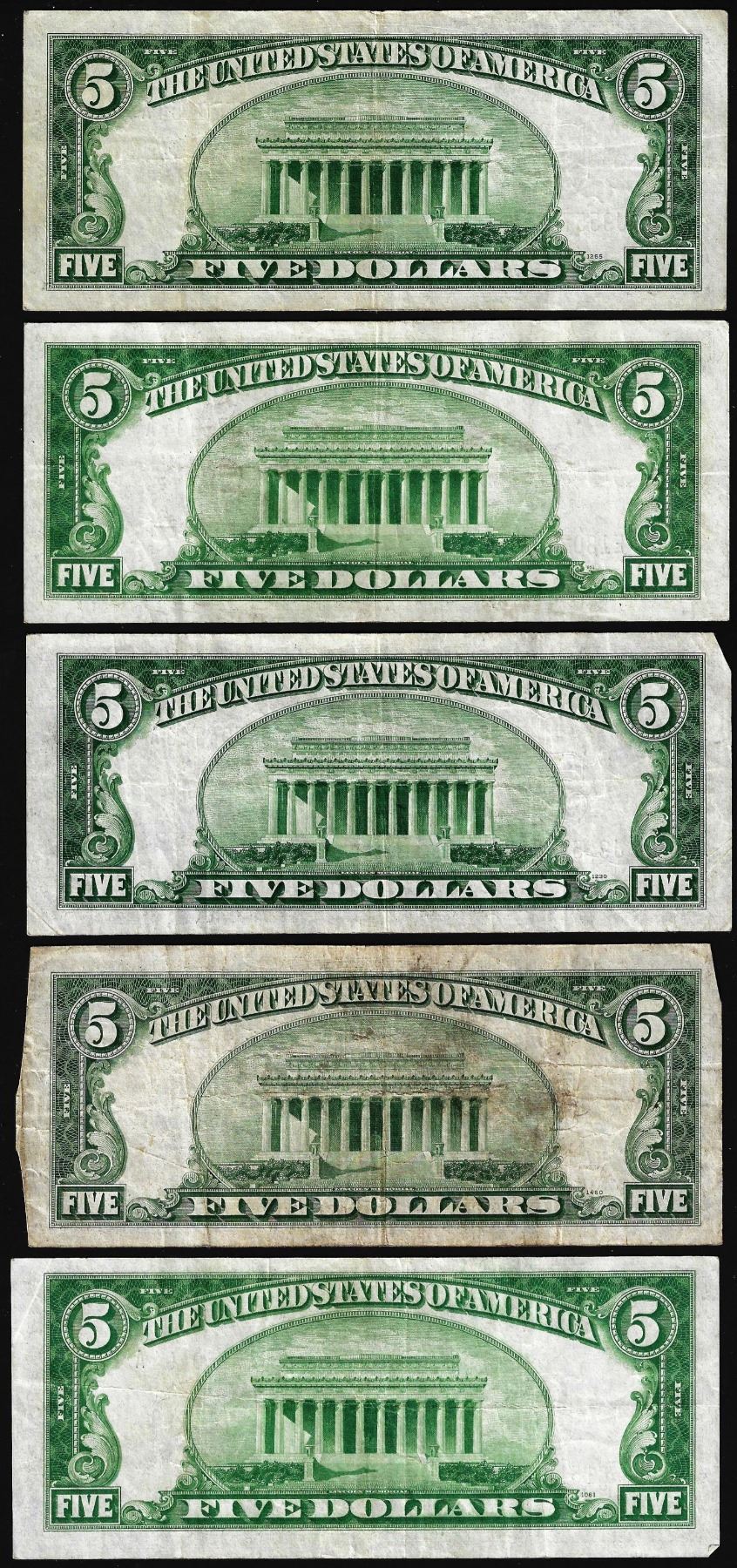 One Lot of (5) 1934A $5 Silver Certificate Notes.