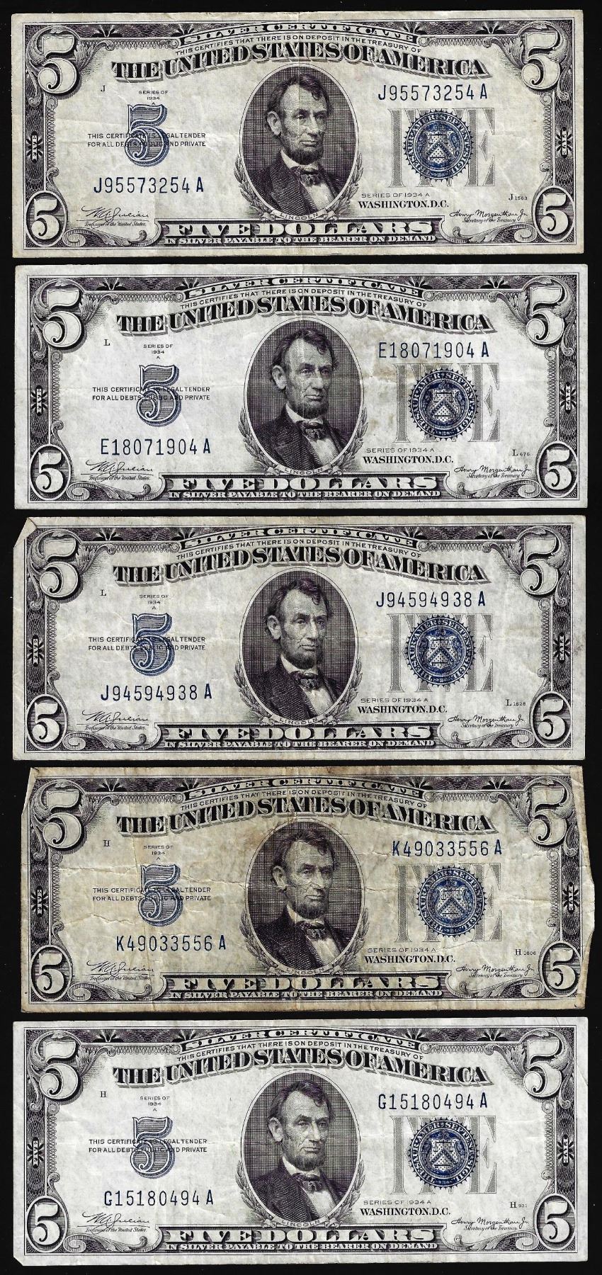 One Lot of (5) 1934A $5 Silver Certificate Notes.