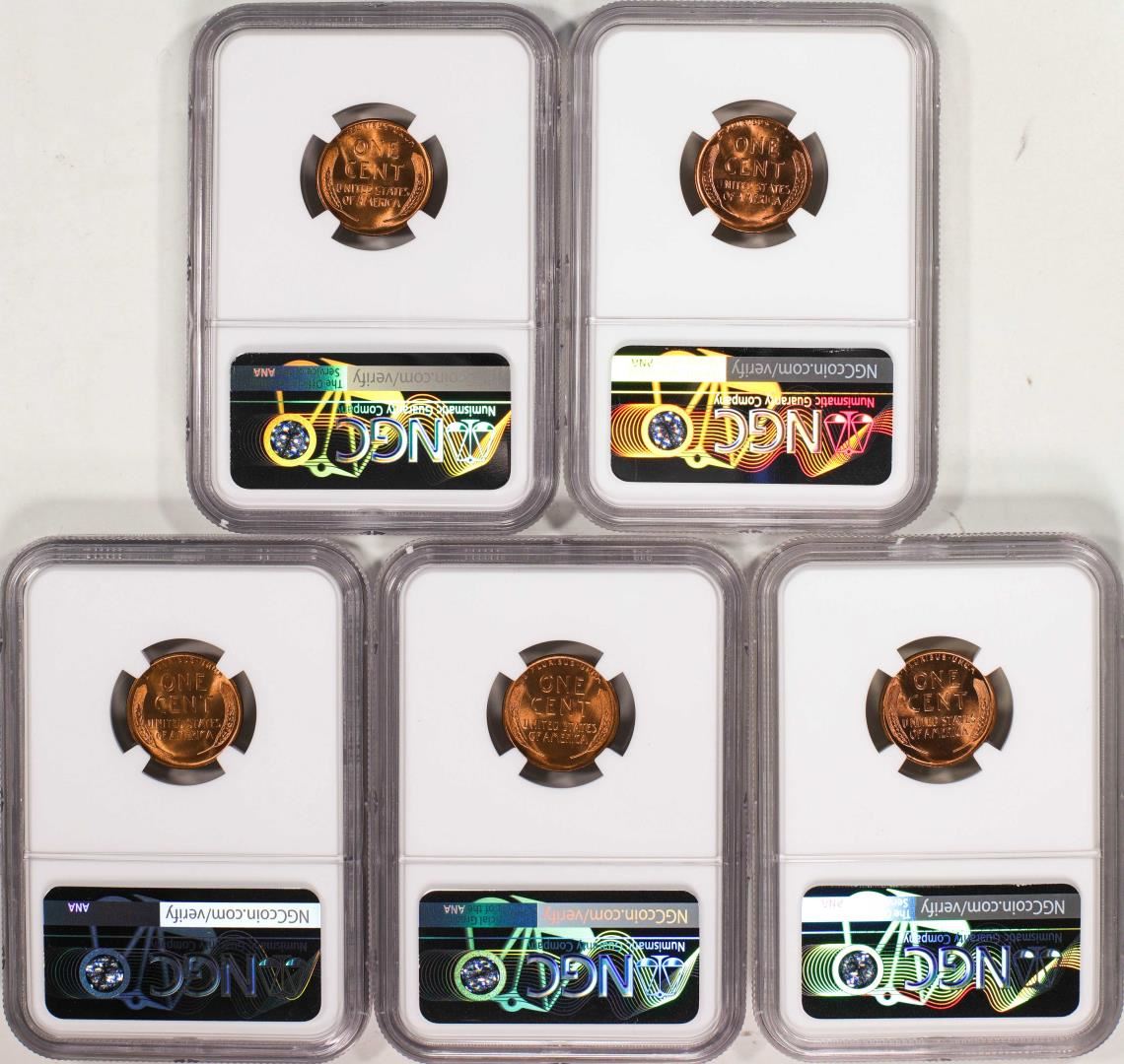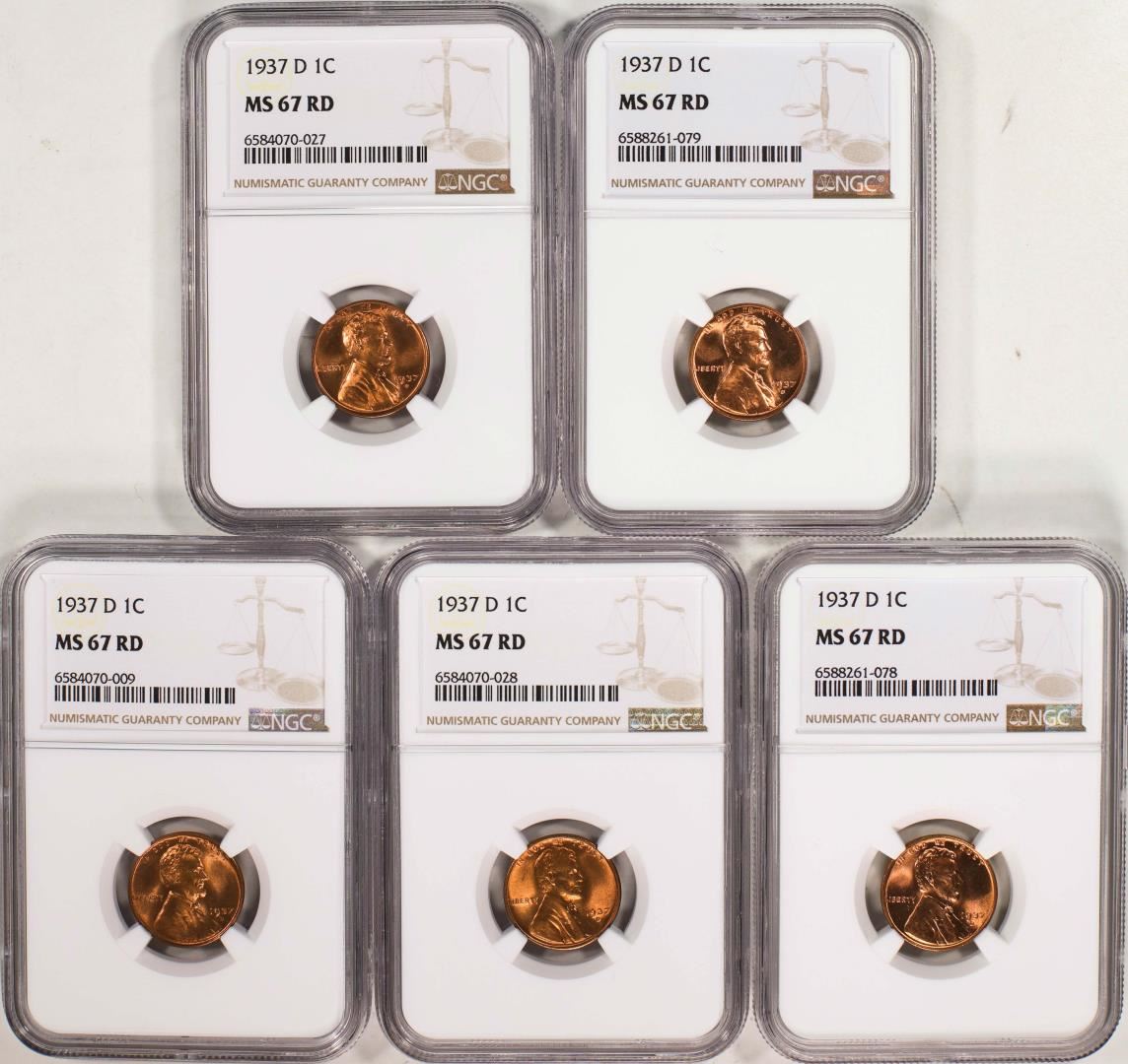 One Lot of (5) 1937-D Lincoln Wheat Cent Coins NGC MS67RD. NGC Certified.