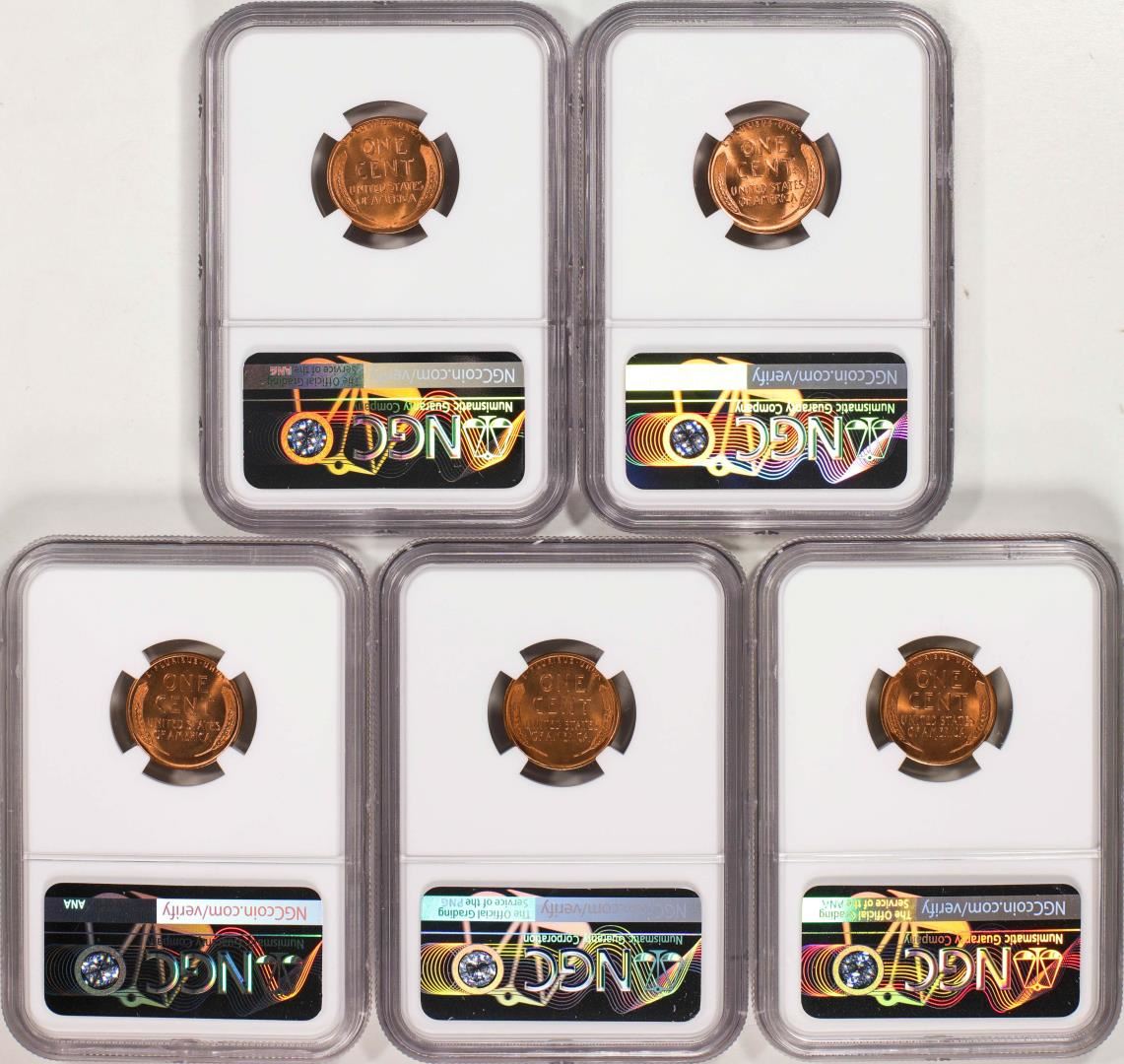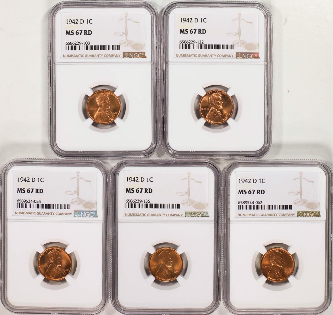 One Lot of (5) 1942-D Lincoln Wheat Cent Coins NGC MS67RD. NGC Certified.