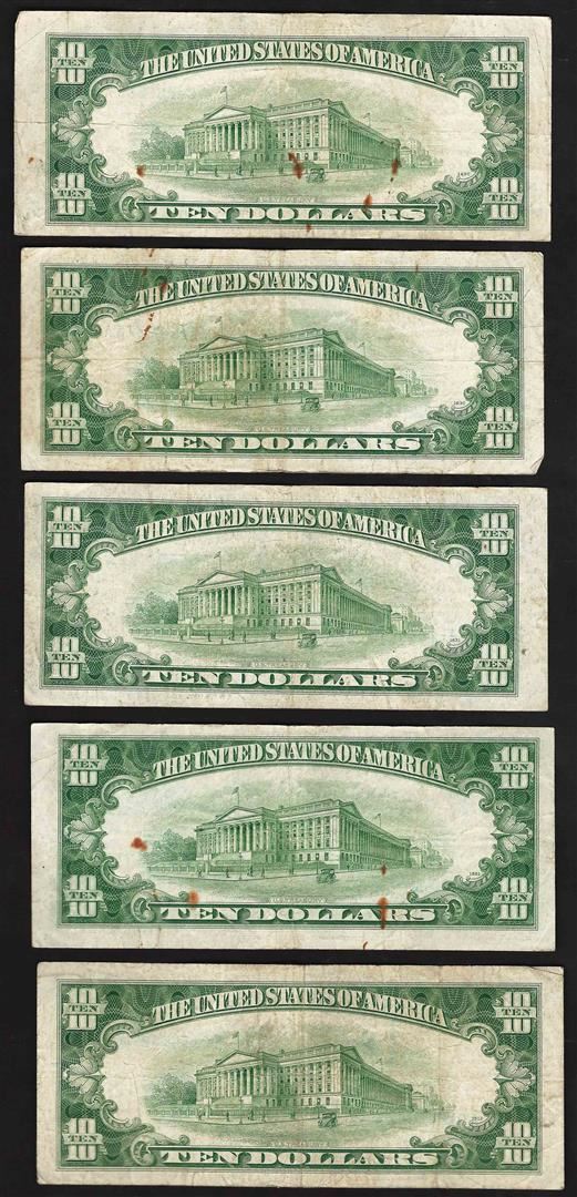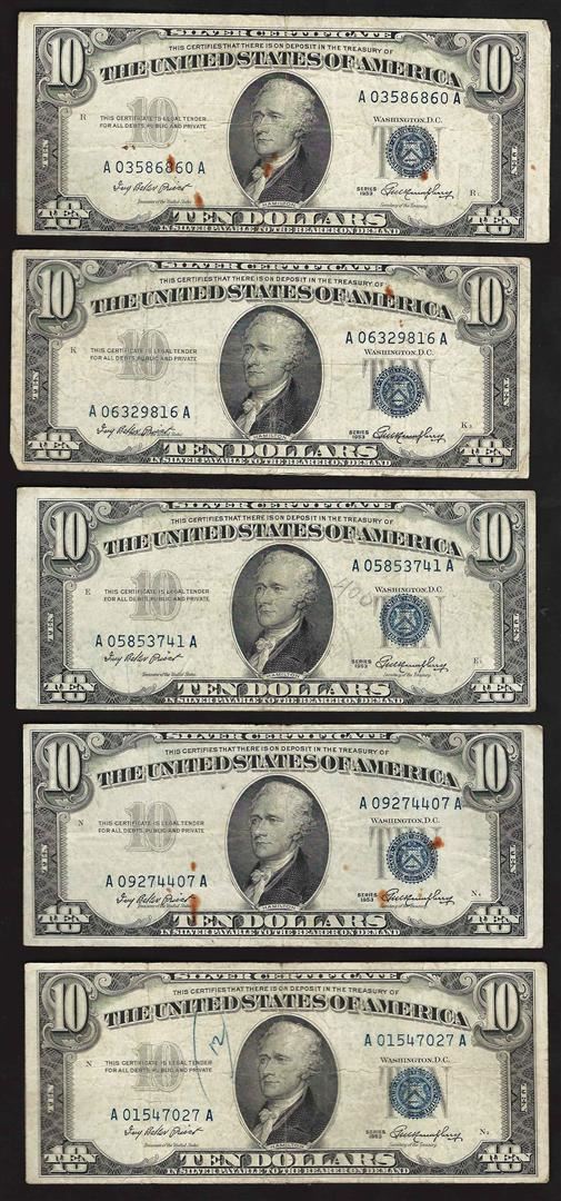 One Lot of (5) 1953 $10 Silver Certificate Notes.