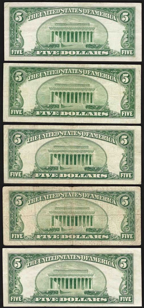 One Lot of (5) 1953 $5 Silver Certificate Notes.