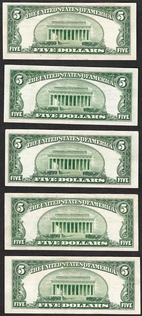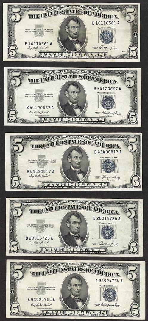 One Lot of (5) 1953 $5 Silver Certificate Notes.