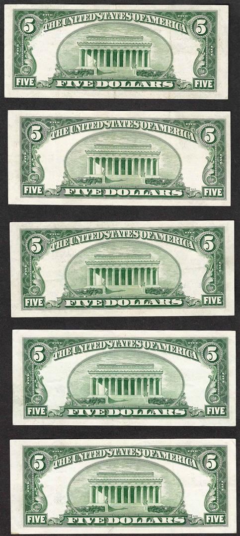 One Lot of (5) 1953 $5 Silver Certificate Notes.