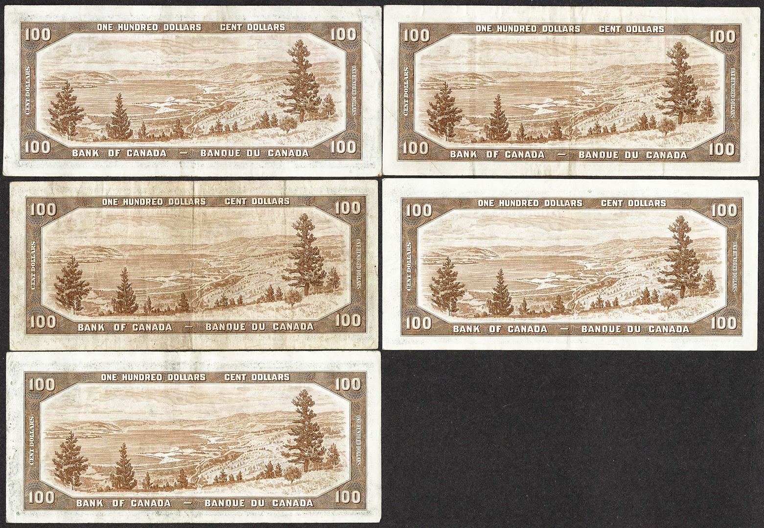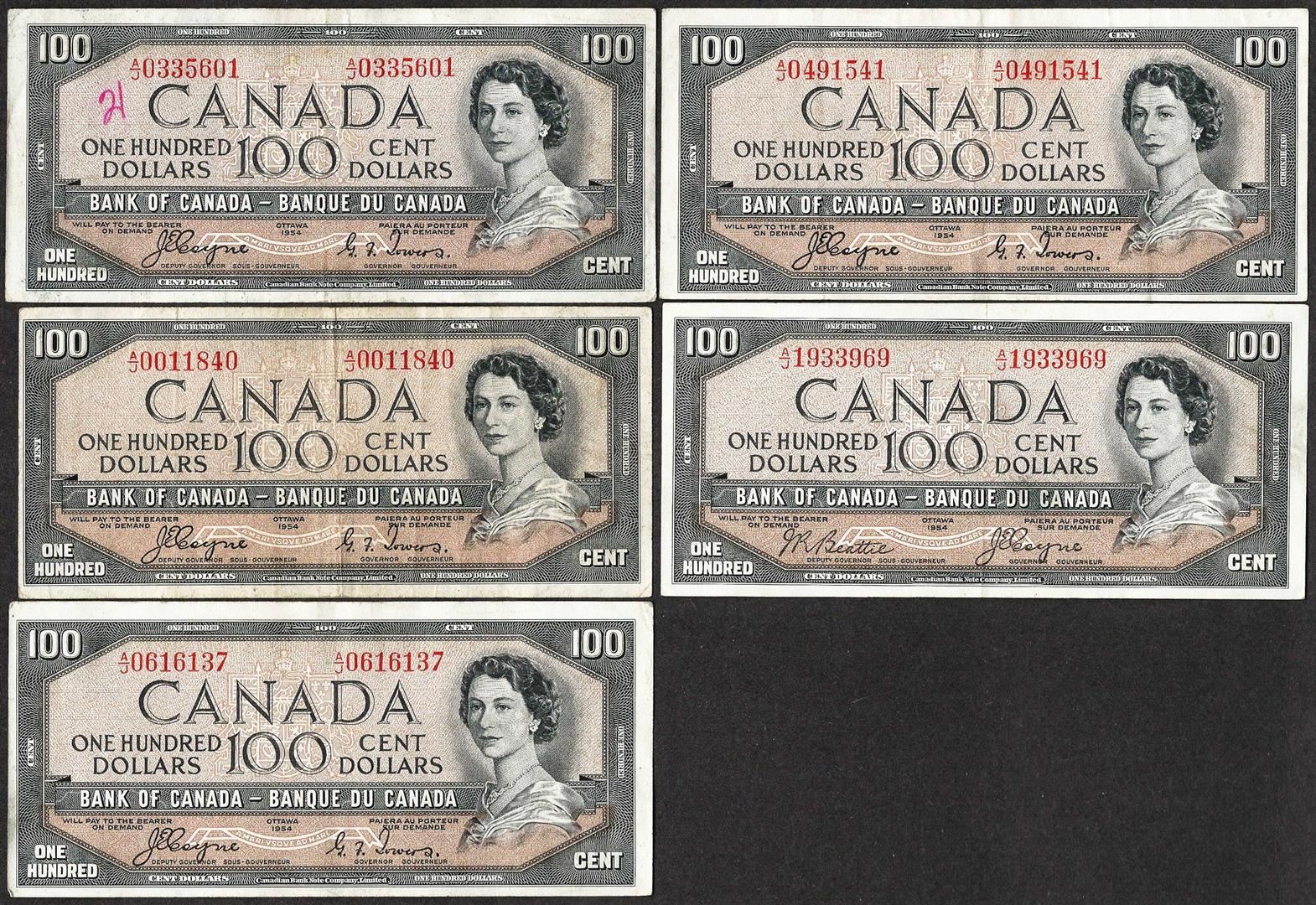 One Lot of (5) 1954 $100 Bank of Canada Notes.