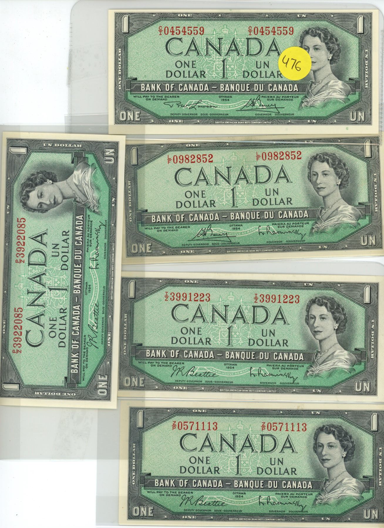 Lot of 5, 1954 uncirculated 1 dollar bills