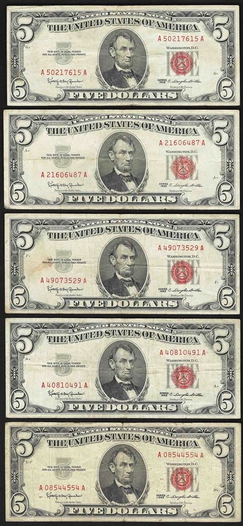 One Lot of (5) 1963 $5 Legal Tender Notes.