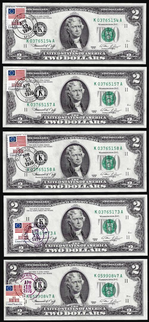 One Lot of (5) 1976 $2 Federal Reserve Notes Dallas First Day Stamps.