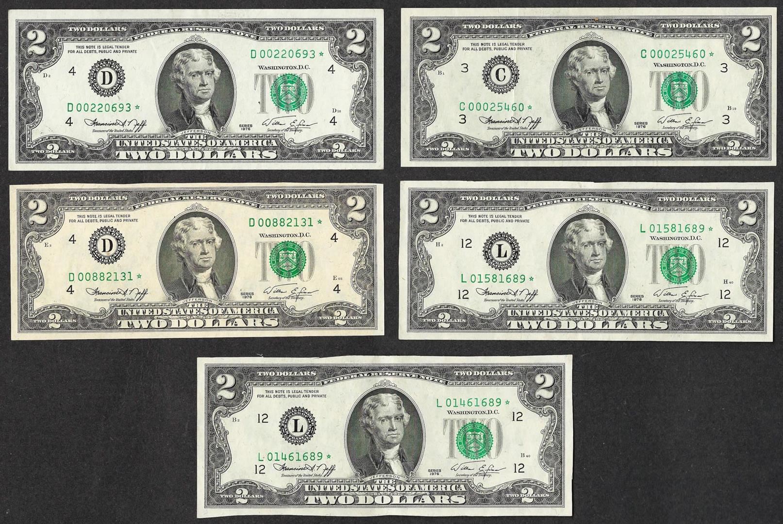 One Lot of (5) 1976 $2 Federal Reserve STAR Notes.