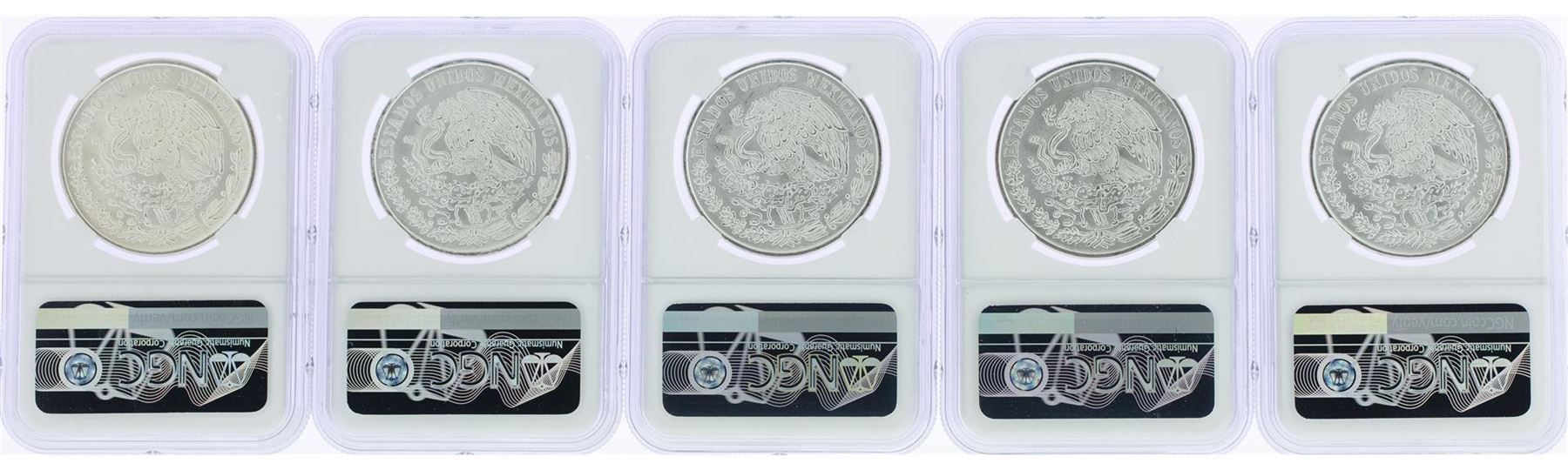 Lot of (5) 1977Mo Mexico 100 Pesos Silver Coins NGC MS66 Level Date