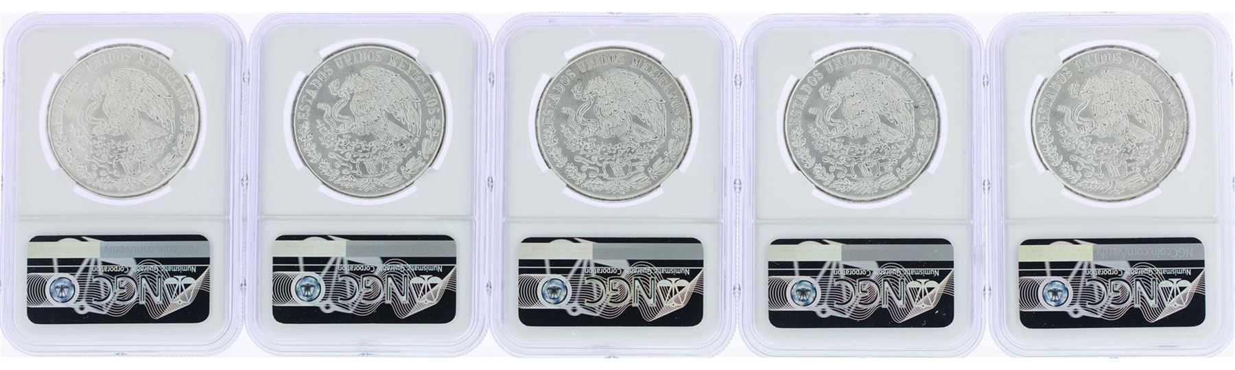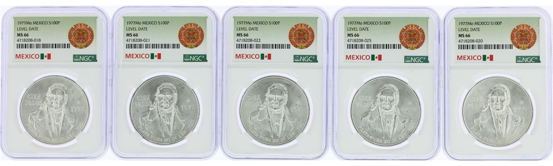 Lot of (5) 1977Mo Mexico 100 Pesos Silver Coins NGC MS66 Level Date