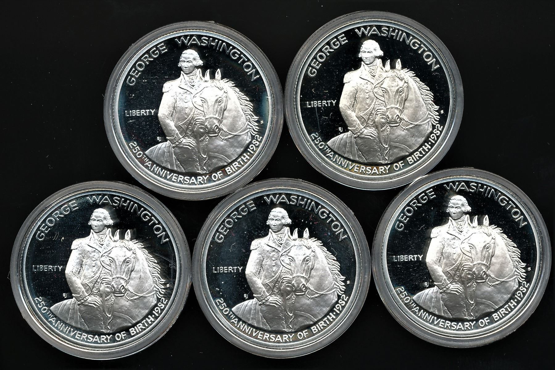 These 1982 George Washington Proof Silver Half-Dollars were minted in honor of the 250th anniversary of Washington's birth. Containing .3617 oz actual Silver weight, these coins are popular for their collectibility and Silver value alike.