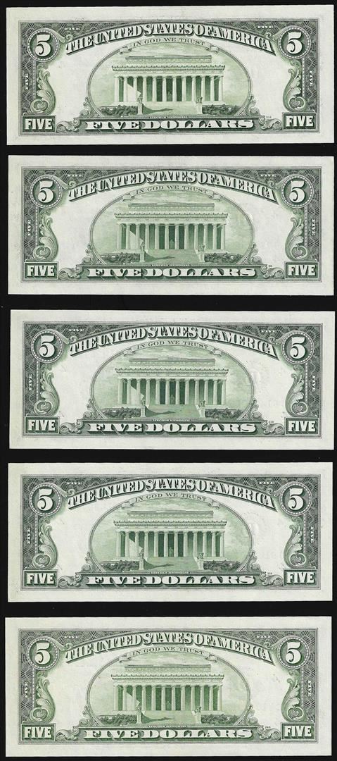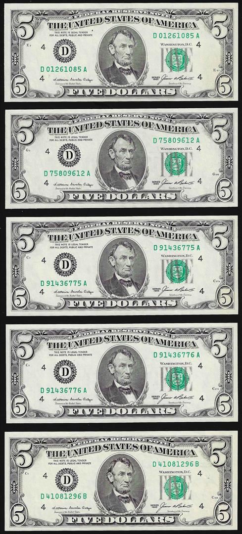 One Lot of (5) 1985 $5 Federal Reserve Notes Choice Uncirculated.