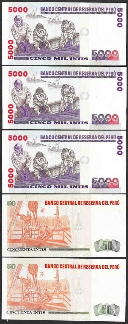 One Lot of (5) 1987/1988 Peru Intis Uncirculated Bank Notes.