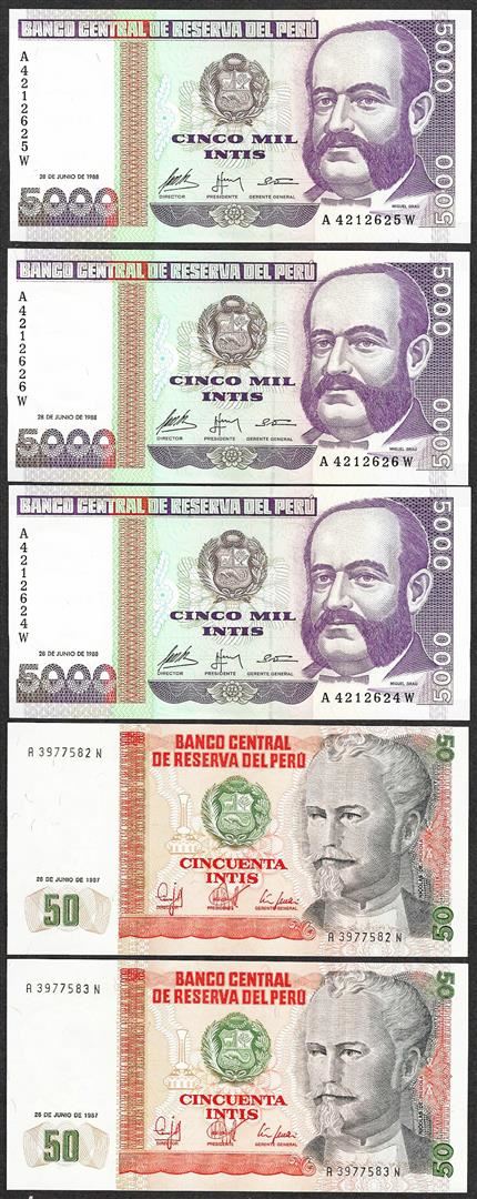 One Lot of (5) 1987/1988 Peru Intis Uncirculated Bank Notes.