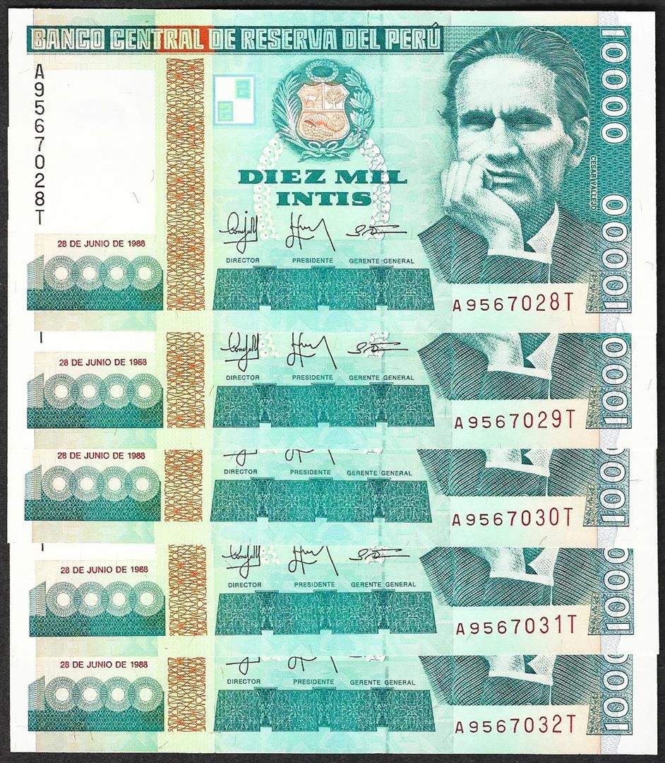One Lot of (5) 1988 Peru Diez Mil Intis Uncirculated Bank Notes.