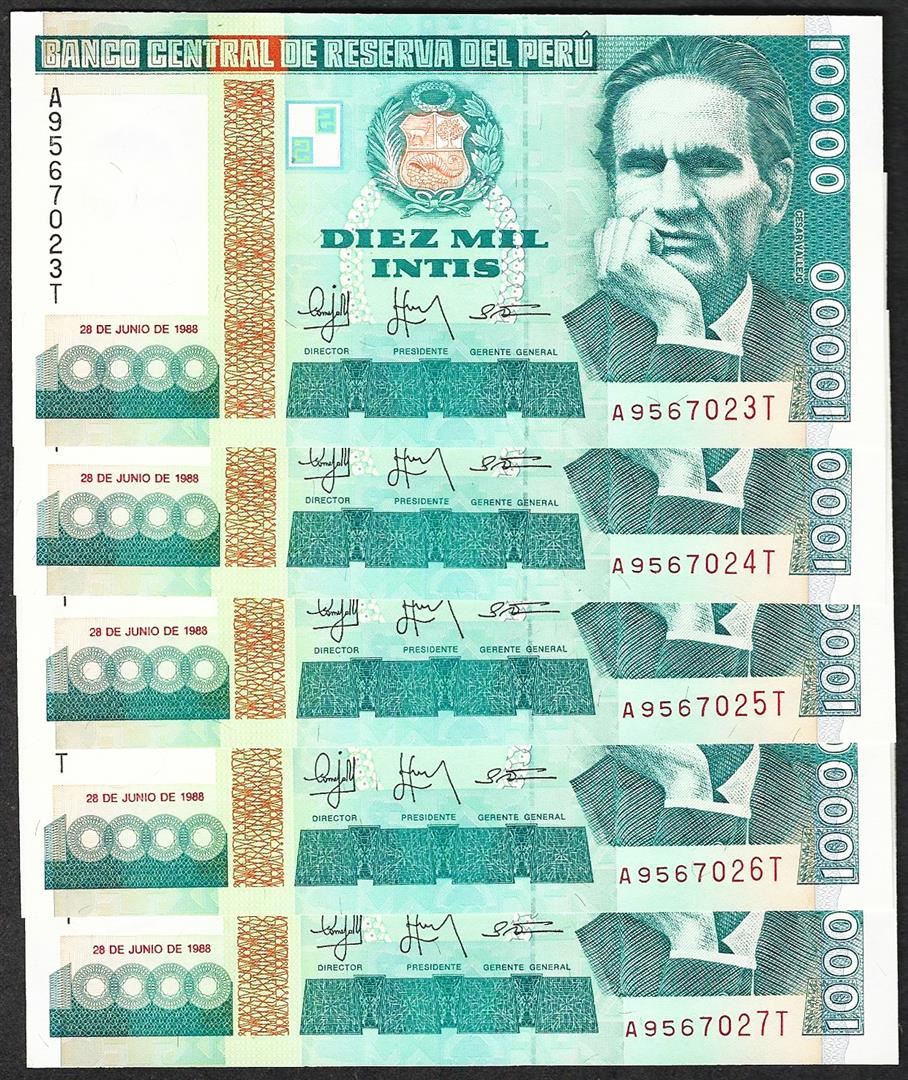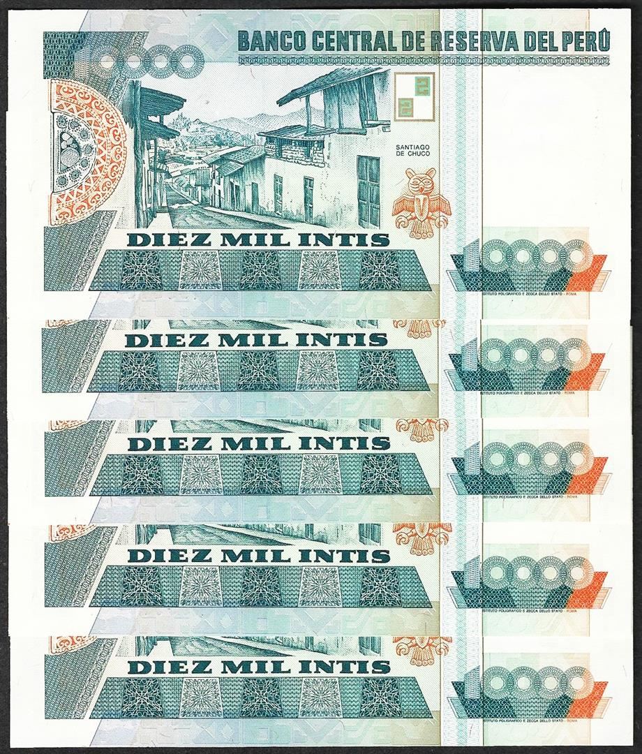 One Lot of (5) 1988 Peru Diez Mil Intis Uncirculated Bank Notes.