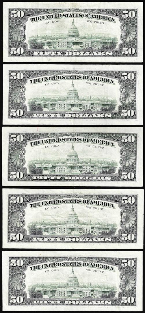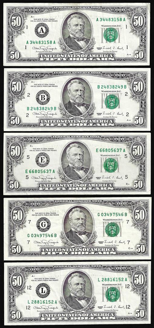 One Lot of (5) 1990 $50 Federal Reserve Notes Minor Offset Error.