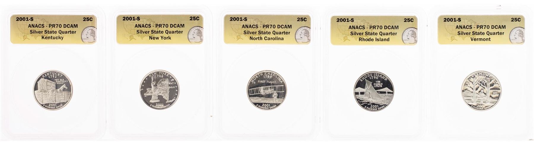 Lot of (5) 2001-S Proof Silver State Quarter Coins ANACS PR70 DCAM