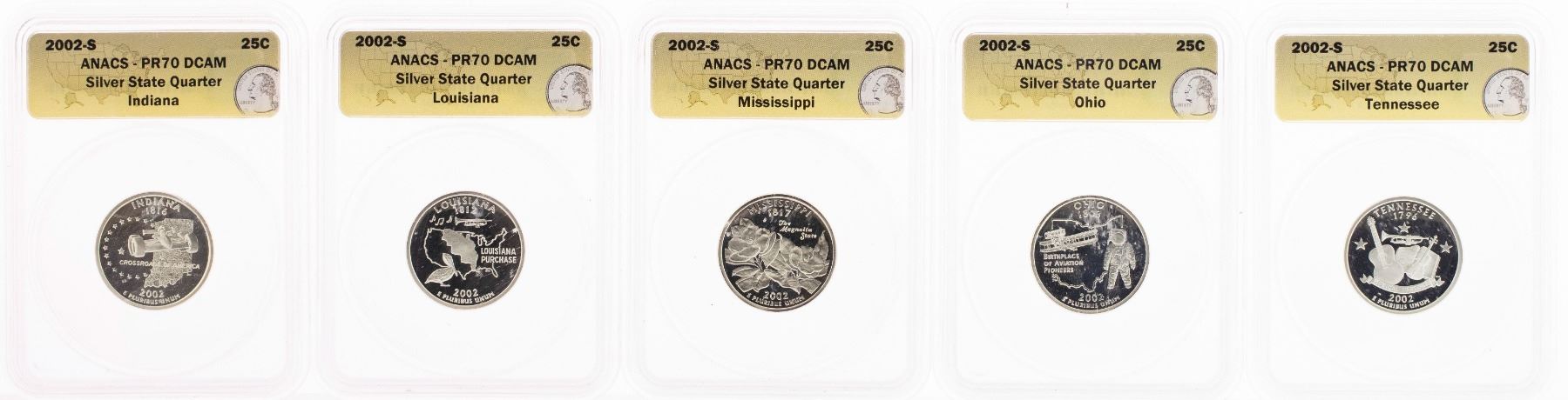 Lot of (5) 2002-S Proof Silver State Quarter Coins ANACS PR70 DCAM