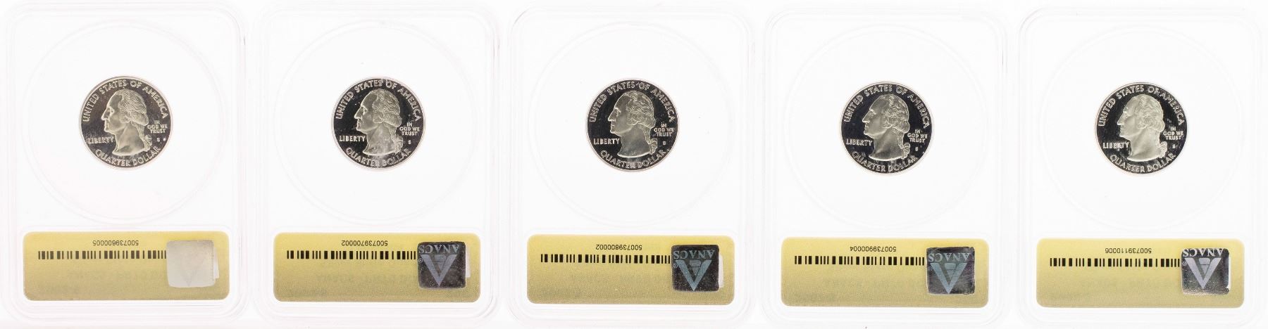 One Lot of (5) 2002-S Proof Silver State Quarter Coins ANACS PR70 DCAM.
